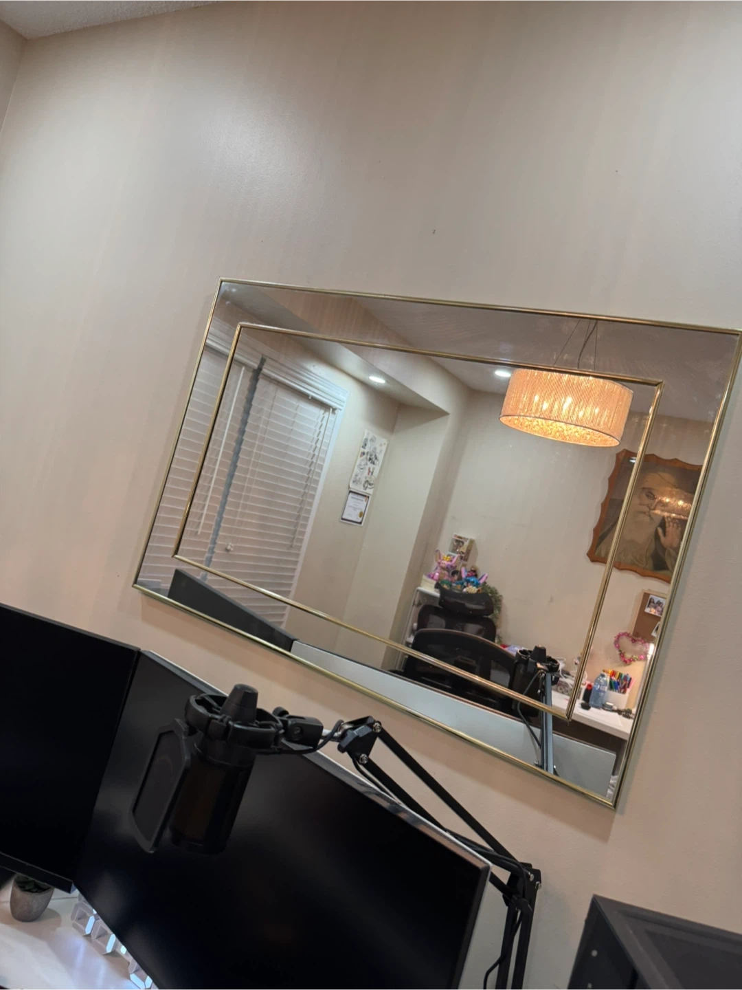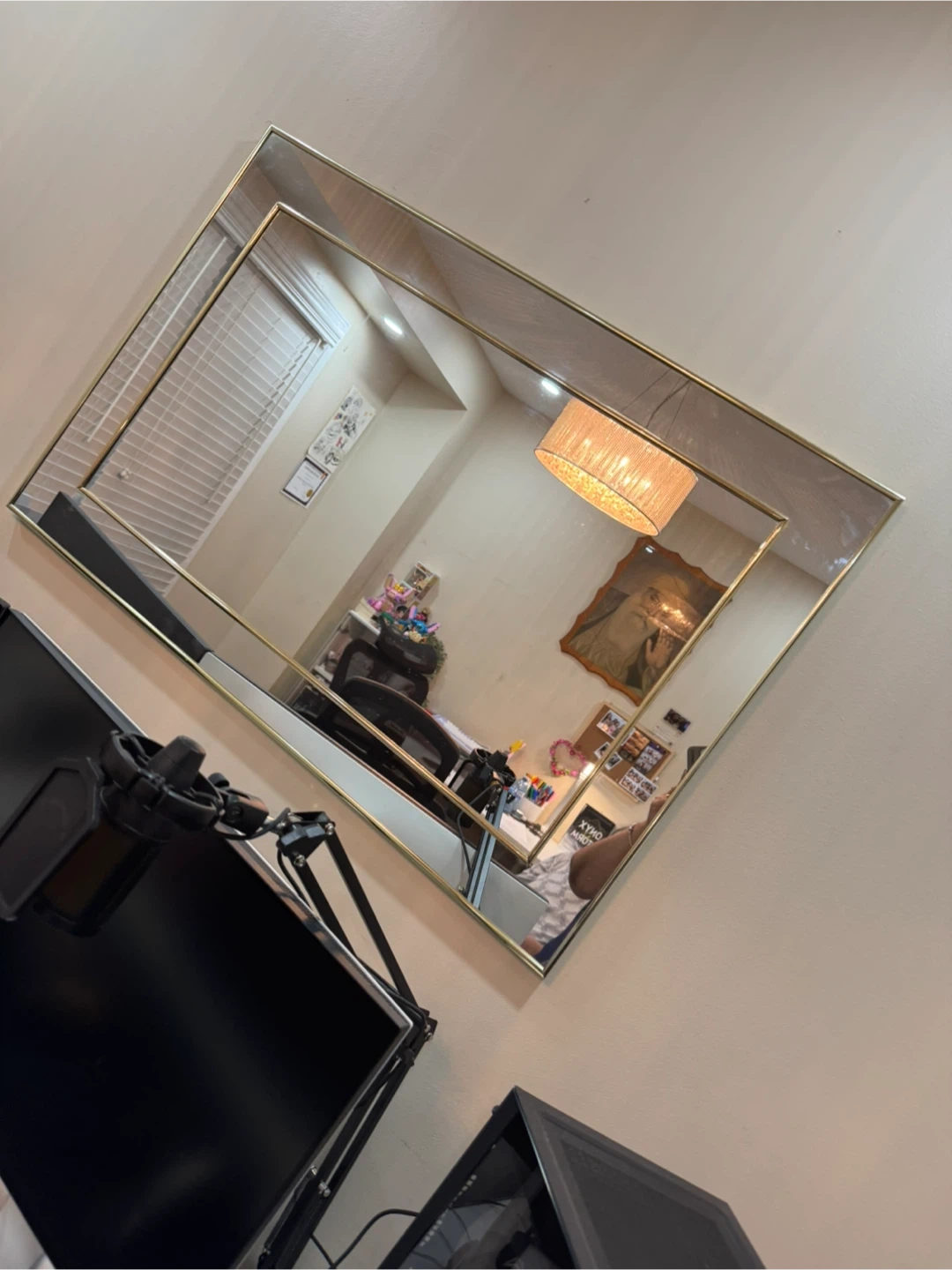 This wall mirror features a sleek gold-toned metal trim. It's a great accent piece for any room. The frame is rectangular with a double-layered design. 2x3 feet