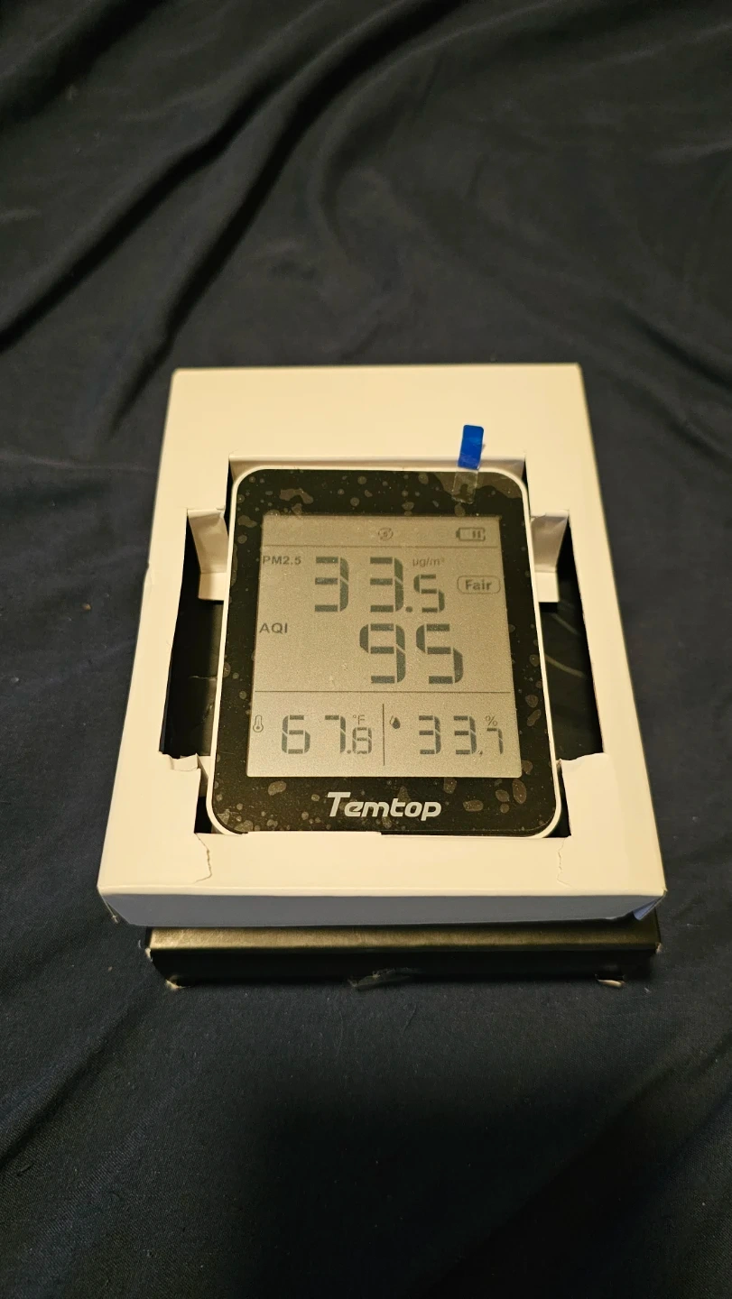 Selling a new Temtop S1 Air Meter. This device monitors PM2.5 and AQI. It comes with a digital display for readings. Useful for checking indoor air quality. Box is a little damaged on front but brand new otherwise.