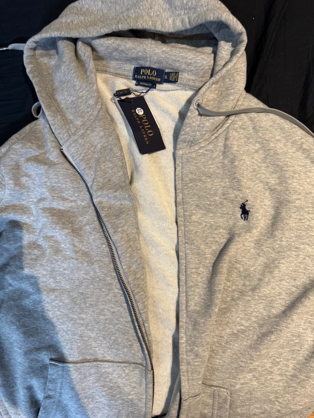 Grey Polo Ralph Lauren zip-up hoodie and sweatpants. Size XL. Custom fit. Comfortable cotton blend material. Fits like L