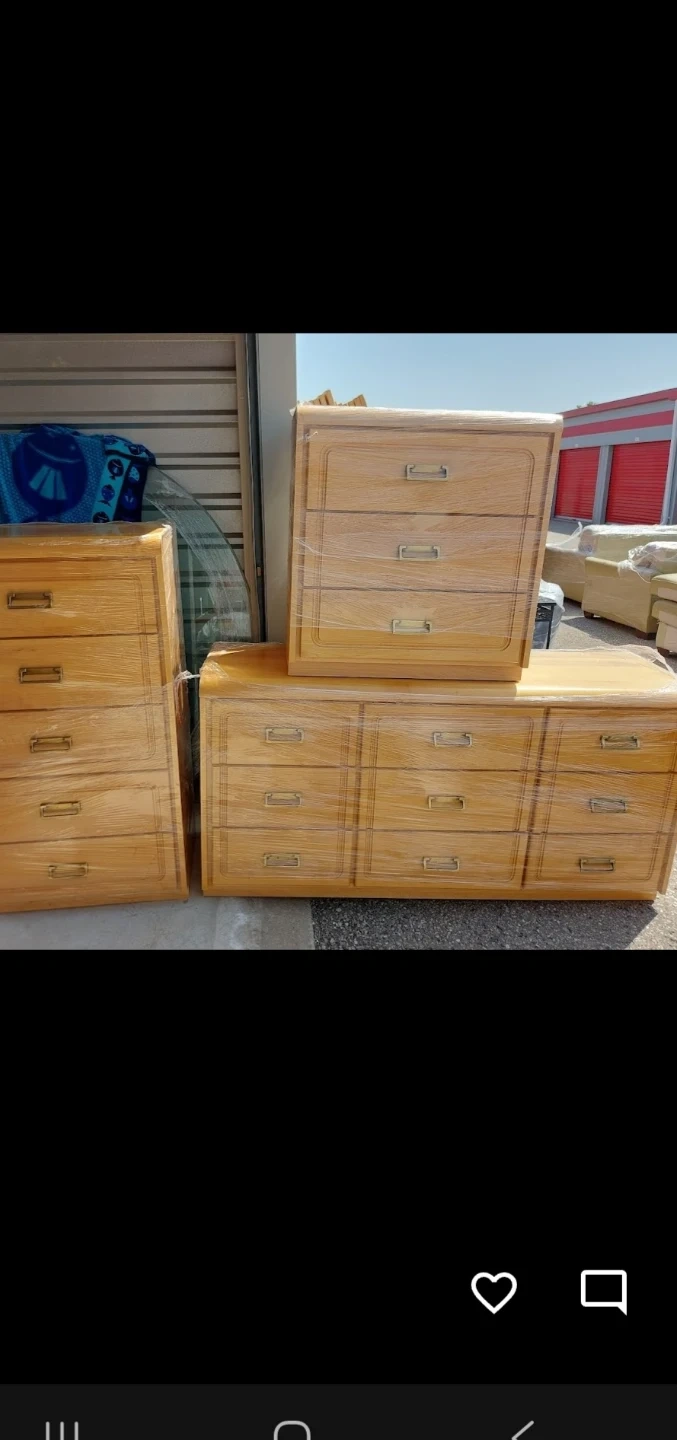 This is a wooden dresser set with a vanity mirror. It's a light wood finish with brass hardware. The set includes a tall dresser and a wider, shorter dresser. This furniture would be great for a bedroom set!