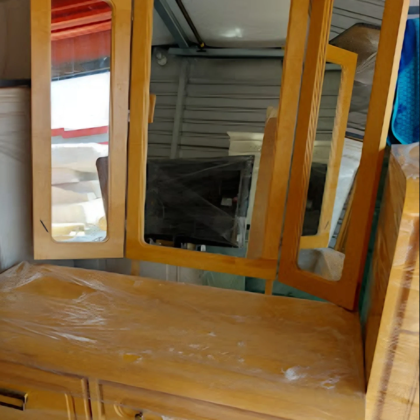 This is a wooden dresser set with a vanity mirror. It's a light wood finish with brass hardware. The set includes a tall dresser and a wider, shorter dresser. This furniture would be great for a bedroom set!