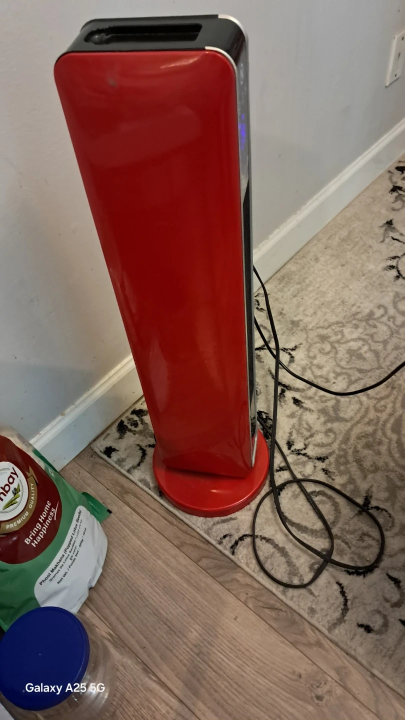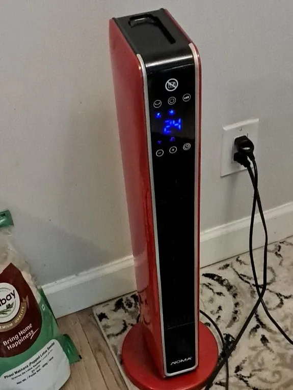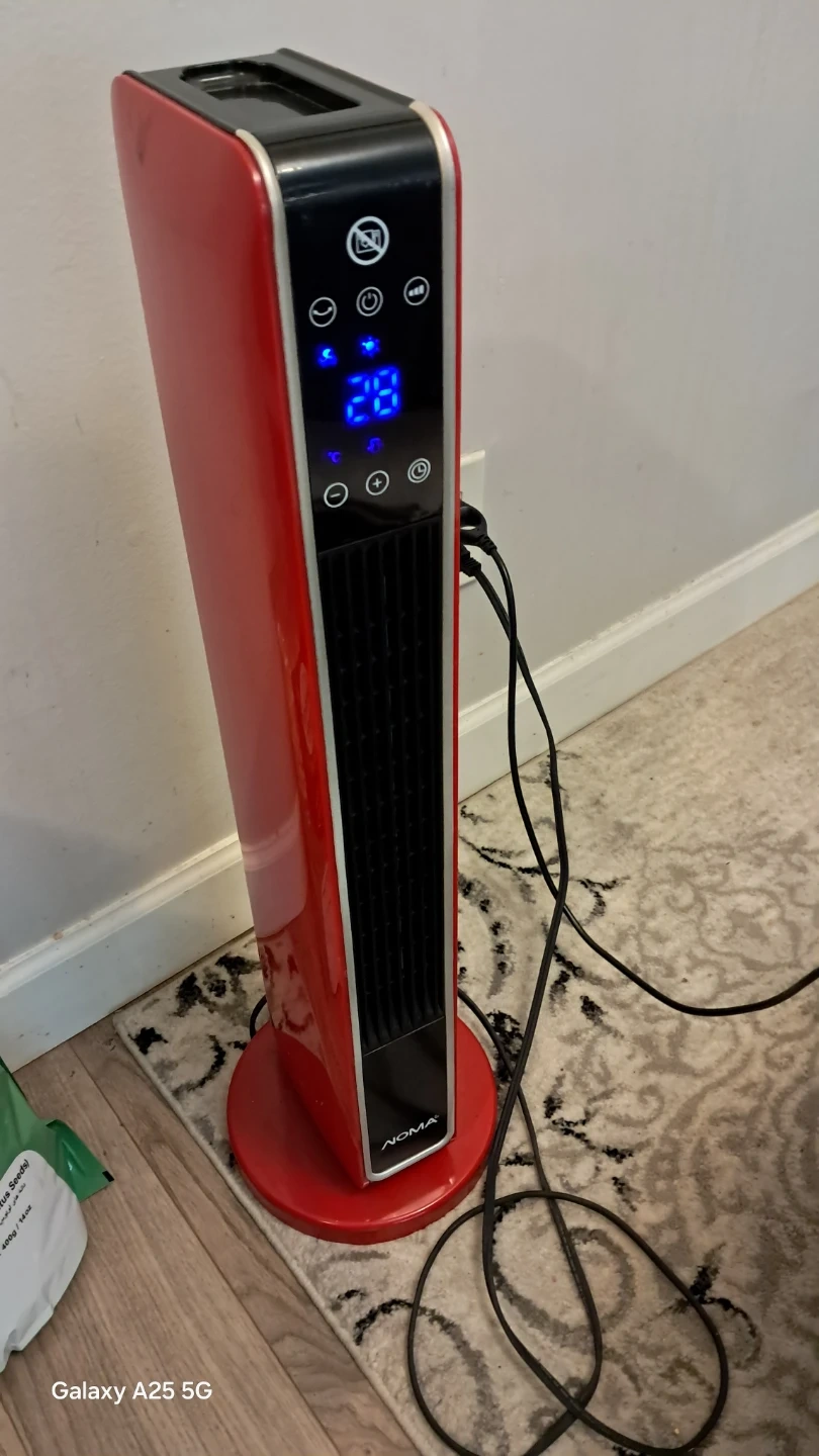 This Noma tower fan heater is red and has a digital display. It's great for heating up a room quickly. Measures approximately 28" tall. I am moving to home country delivery also available a little bit charges depends upon distance