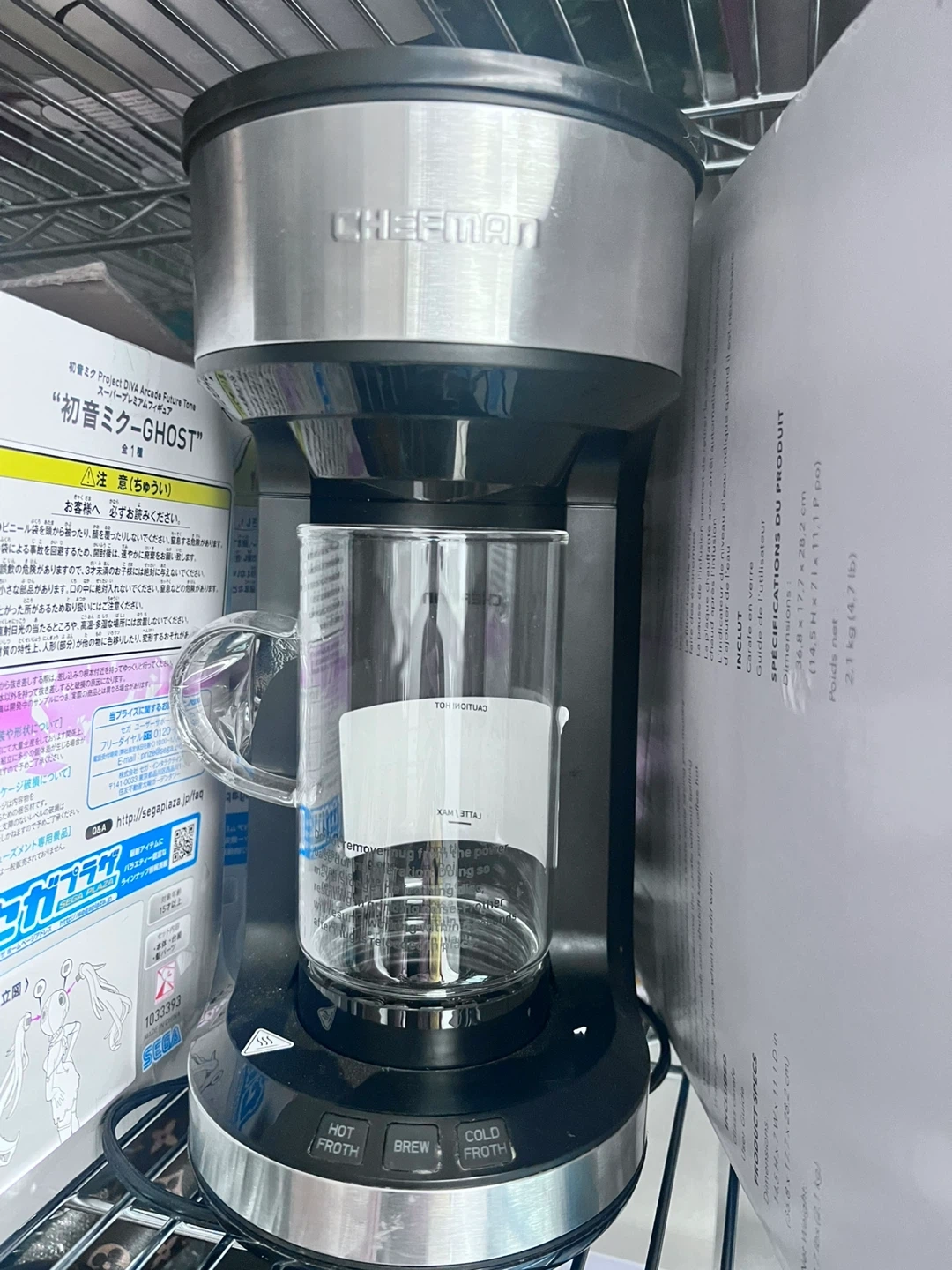 I'm selling a Chefman coffee maker that can do both hot and cold froth! It includes a glass carafe and user guide. It has settings for hot froth, brew, and cold froth. The product specs are 36.8 x 17.7 x 28.2 cm and weighs 2.1 kg