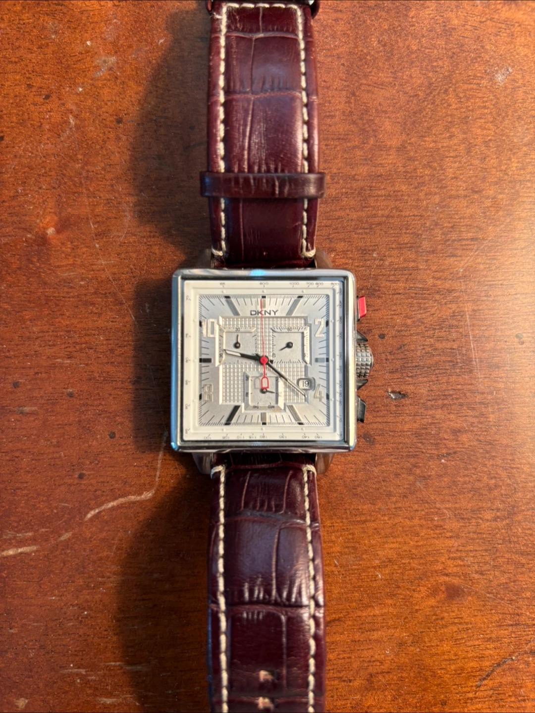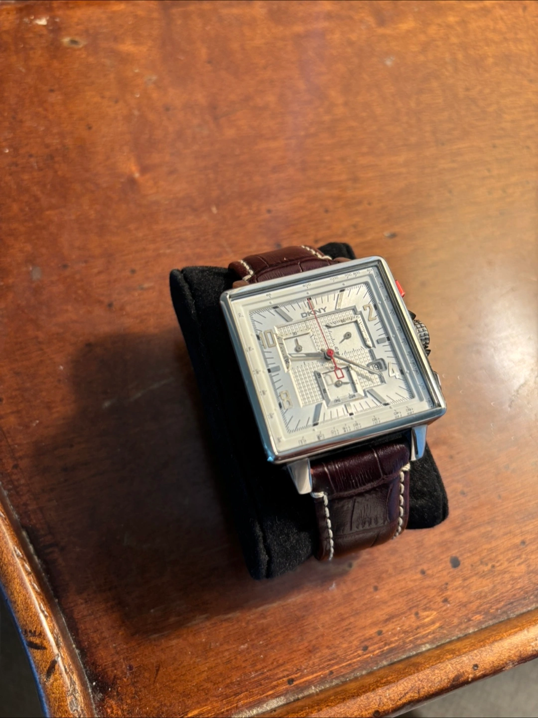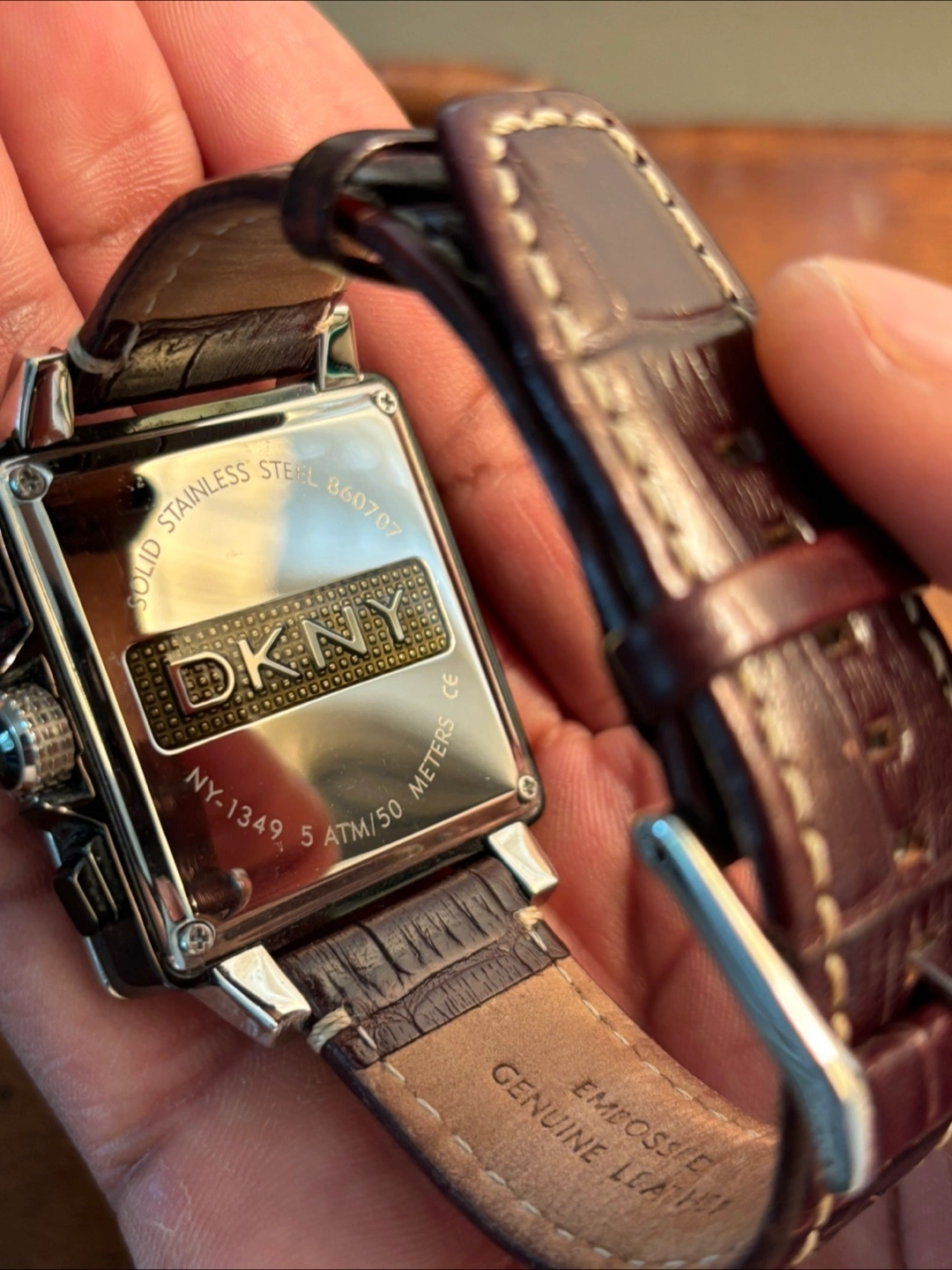 Men's DKNY NY-1349 watch with a brown leather band. The watch features a square face and a stylish design. (Needs new battery)
