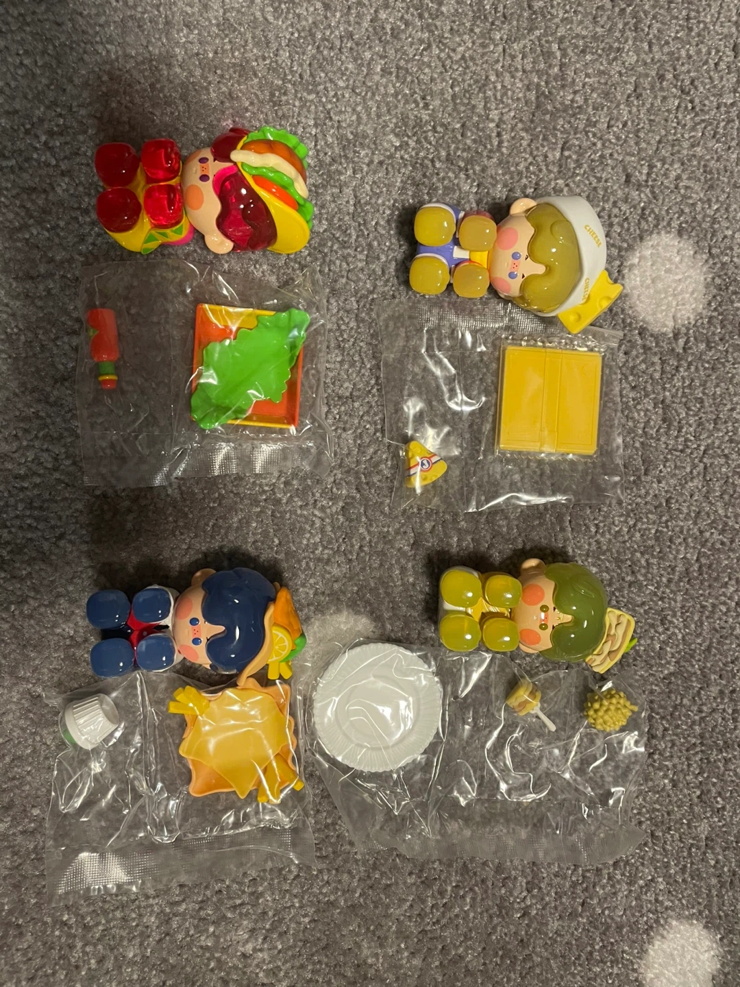 Set of four adorable collectible figurines featuring cute characters with food themes, like burgers and sandwiches. Each figurine comes with small accessories and is individually packaged. These are fun little desk decorations or party favours!