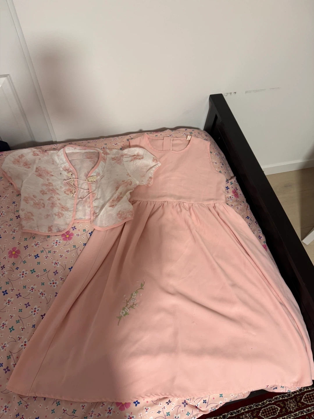 A pretty pink dress paired with a coordinating short-sleeved bolero jacket. The dress features a delicate floral embroidery detail near the hem. The bolero has a classic frog button closure. It's perfect for special occasions or a lovely outfit for parties.