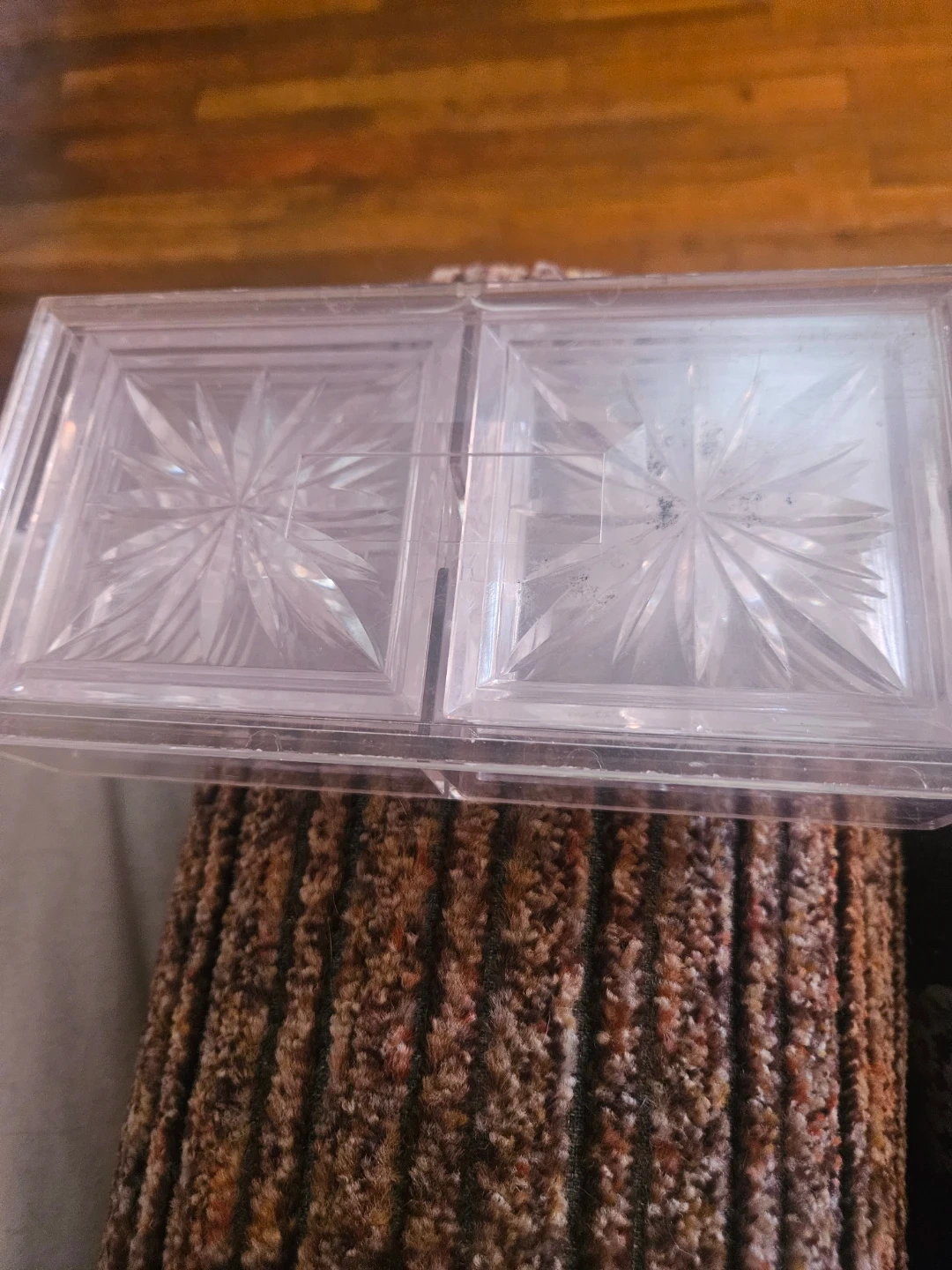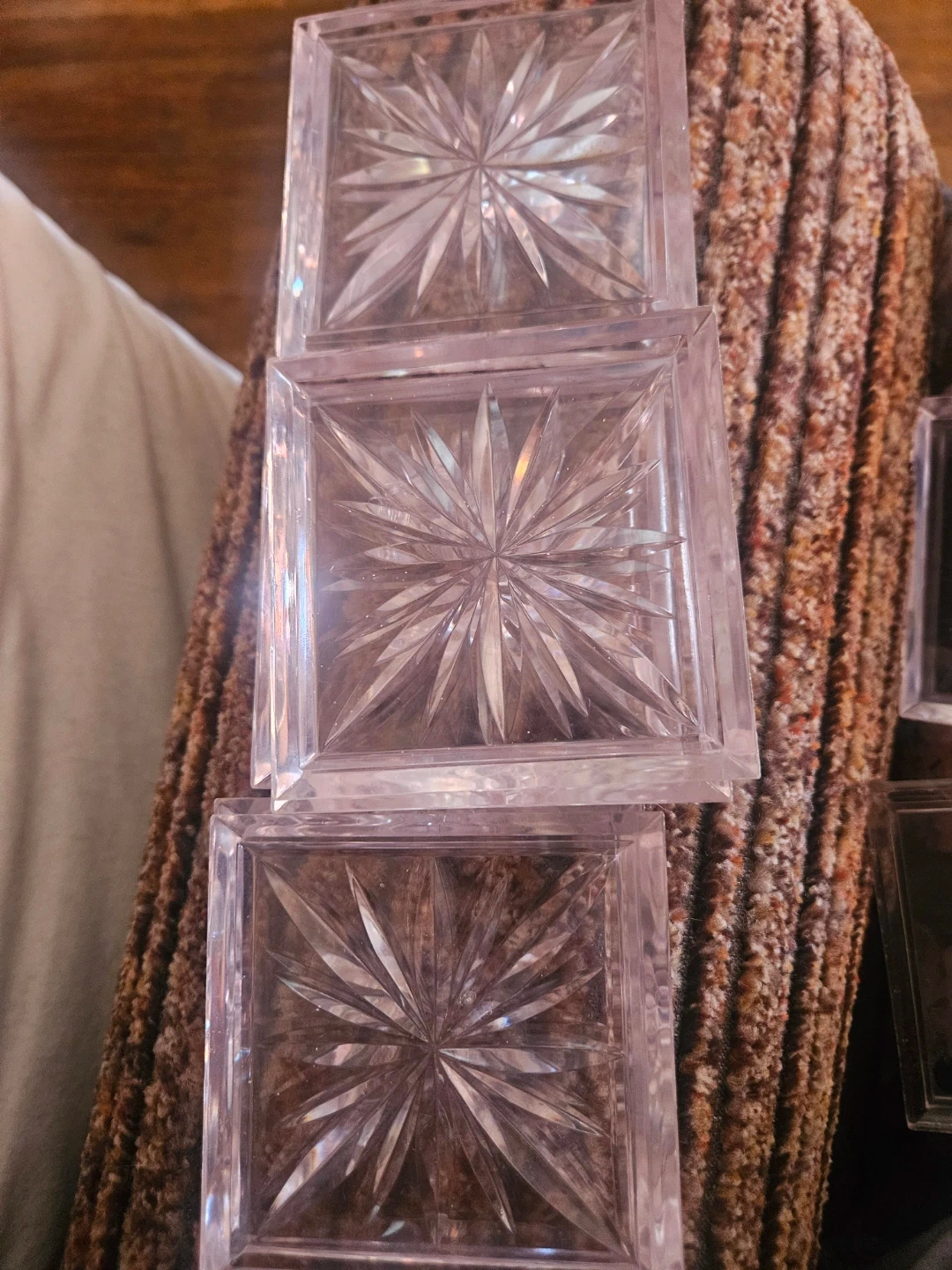 8 Acrylic Lucite coasters featuring a starburst etched design. Coasters are square shaped Dec-O Genuine Duracile Starburst w/ case,Some minor dust and scuffing visible on surfaces. They're a classic addition to any table setting!