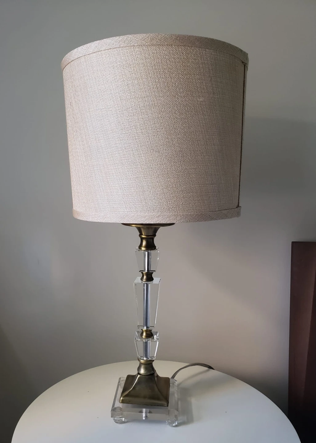 This table lamp features a textured beige drum shade. The base is constructed with clear acrylic and brass-toned metal accents. It's a nice accent for any room.
