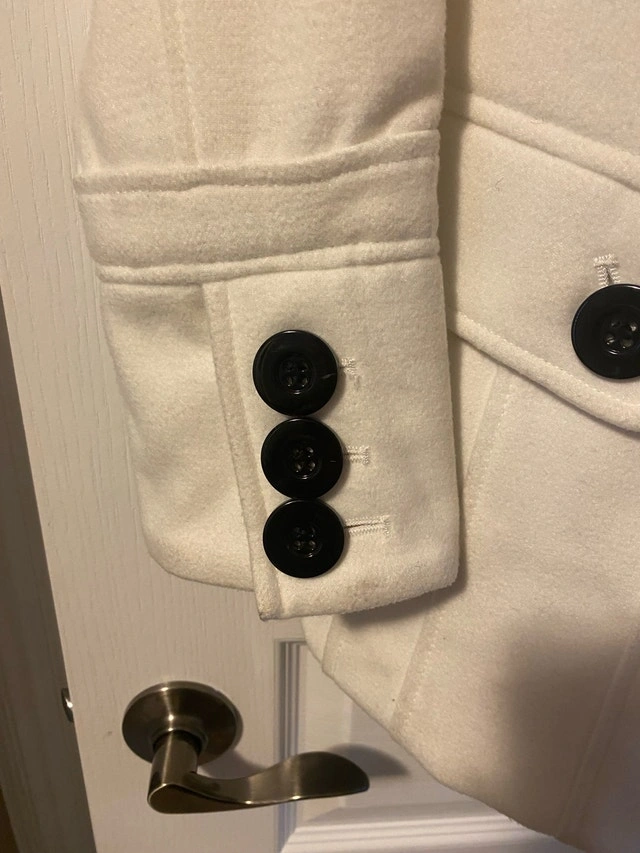 I'm selling a Ricki's winter coat, a stylish and cozy option for chilly days. This cream-colored coat features unique toggle closures and a fitted silhouette. Used but like new condition. Brand: Ricki's. Colour: Cream. Style: Winter Coat with Toggle Closures. Size: Medium (8-10). Cash accepted.