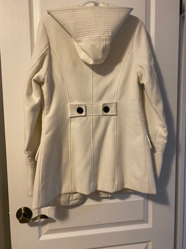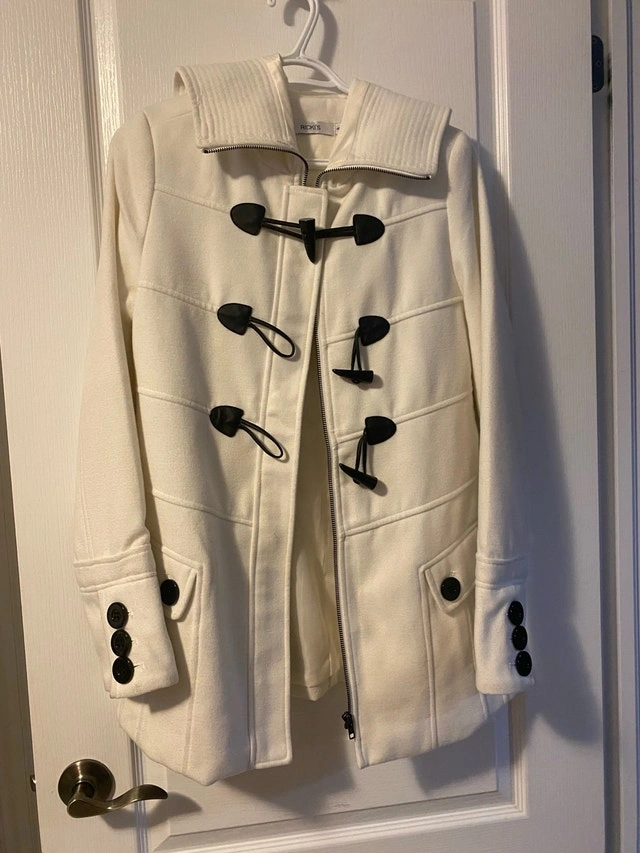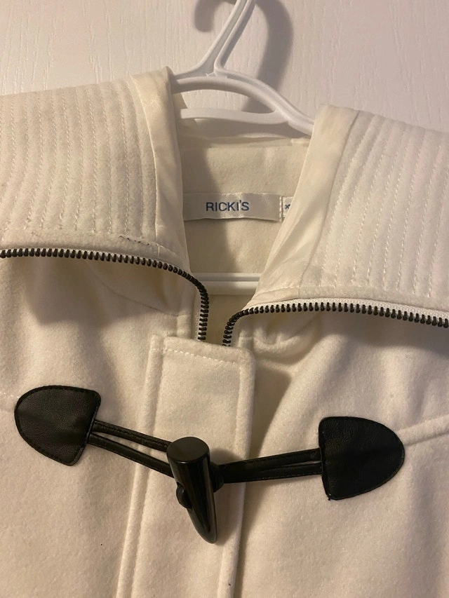 I'm selling a Ricki's winter coat, a stylish and cozy option for chilly days. This cream-colored coat features unique toggle closures and a fitted silhouette. Used but like new condition. Brand: Ricki's. Colour: Cream. Style: Winter Coat with Toggle Closures. Size: Medium (8-10). Cash accepted.