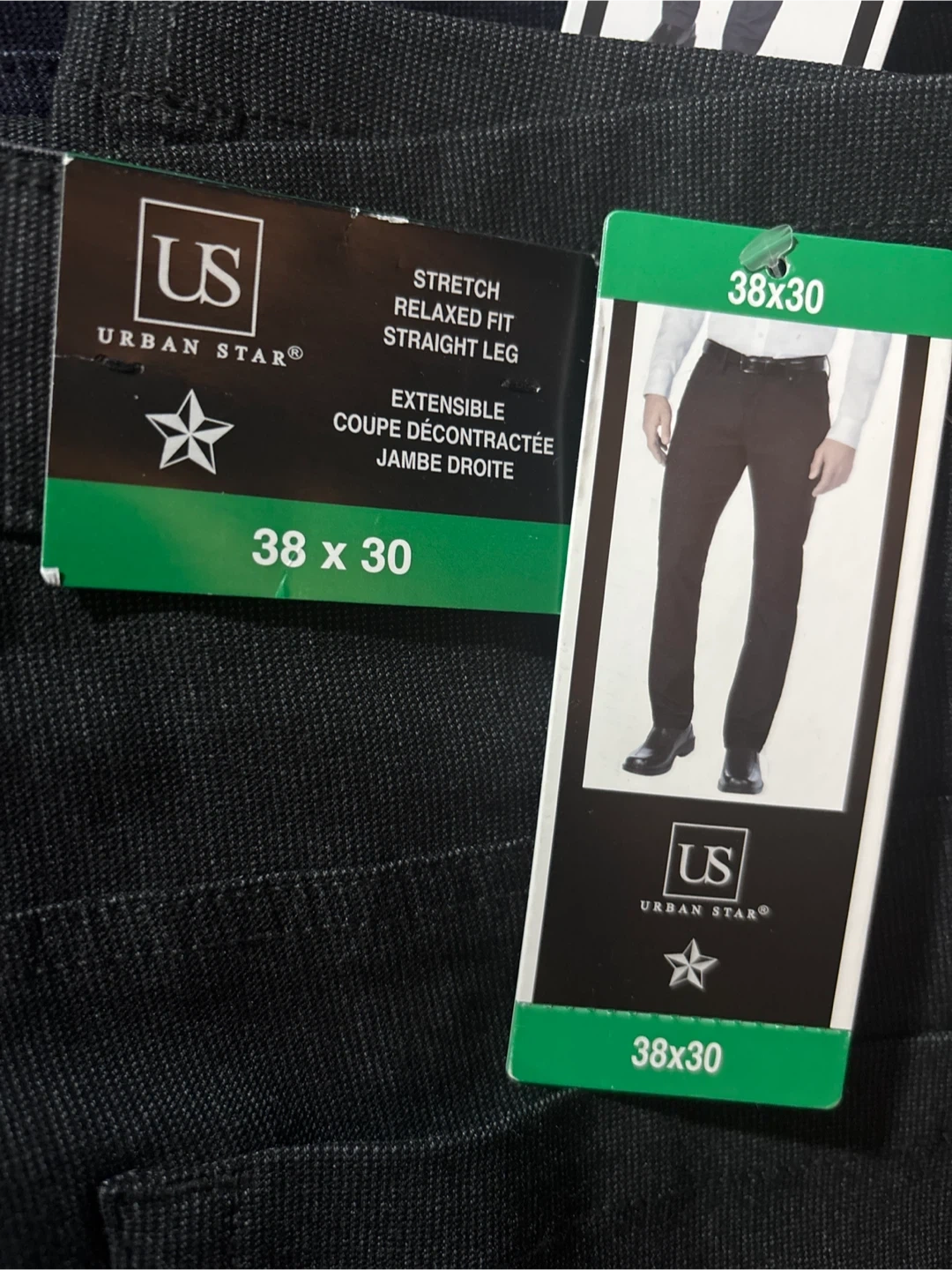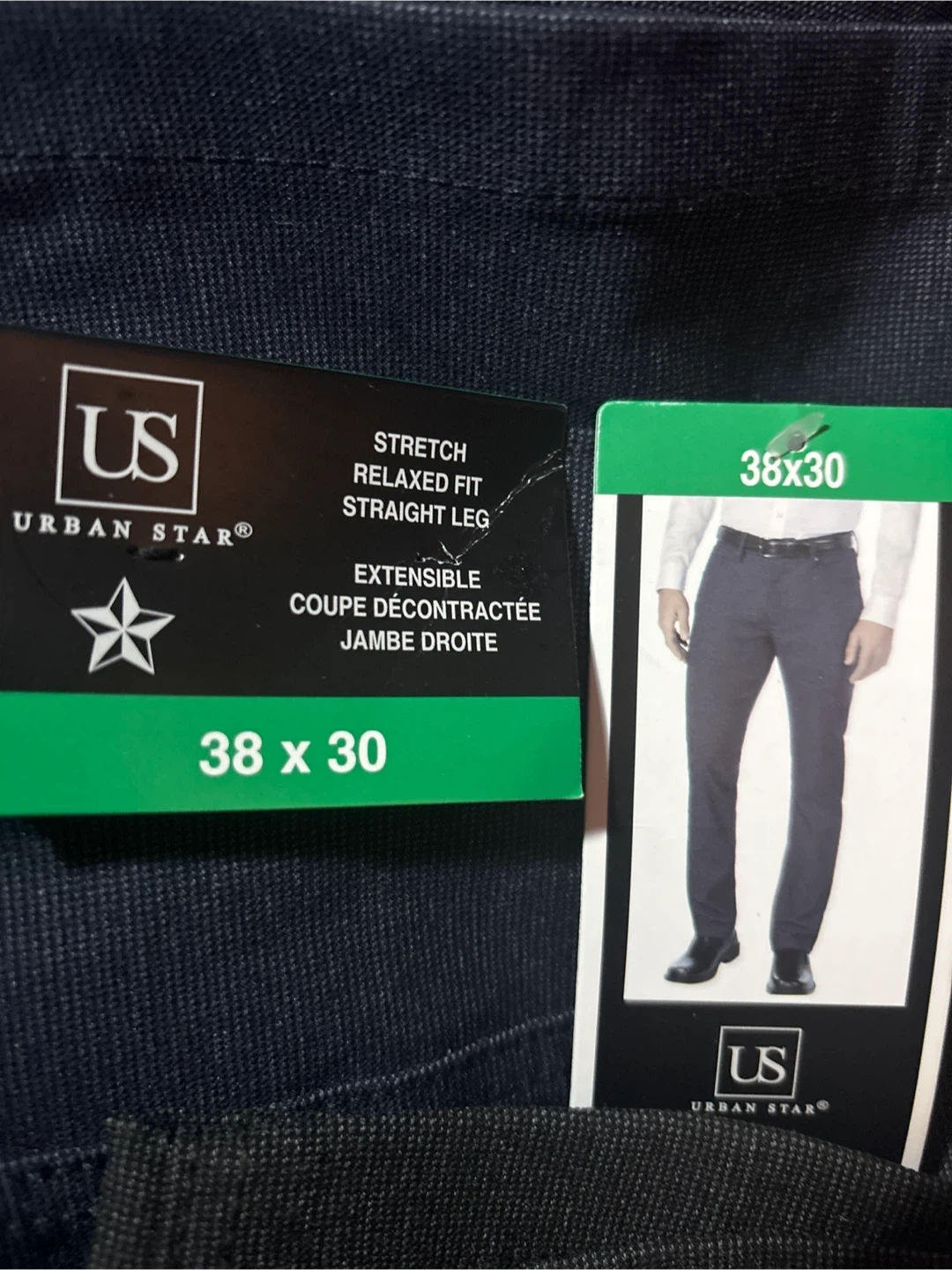- Urban Star stretch relaxed fit straight leg pants, size 38x30. Available in black and blue