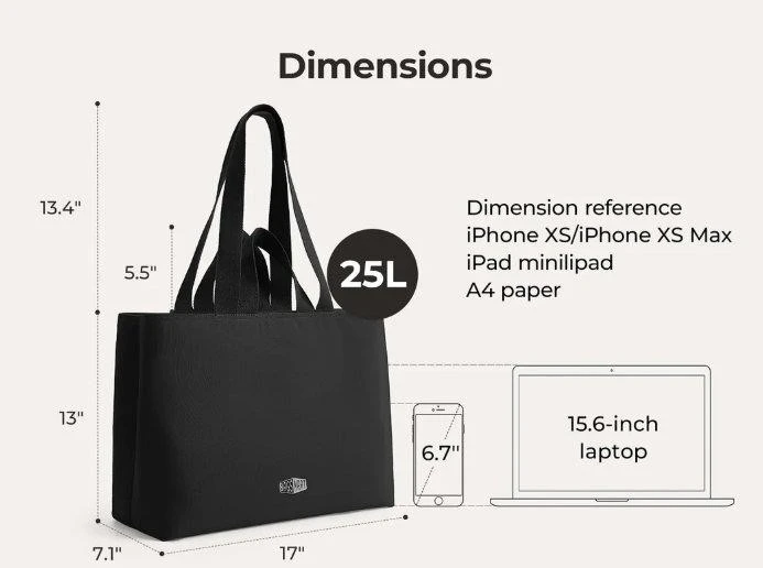 This BAGSMART tote bag is black and has a 25L capacity. It measures 17" wide, 13" tall, and 7.1" deep. It's great for carrying laptops, books, or groceries.