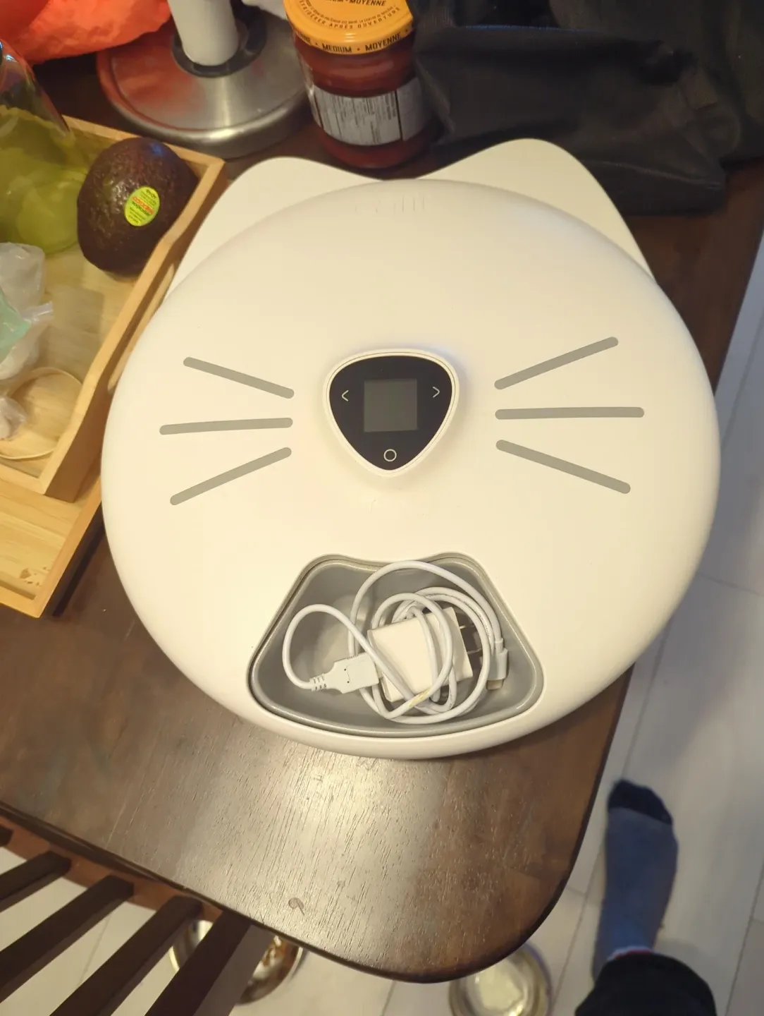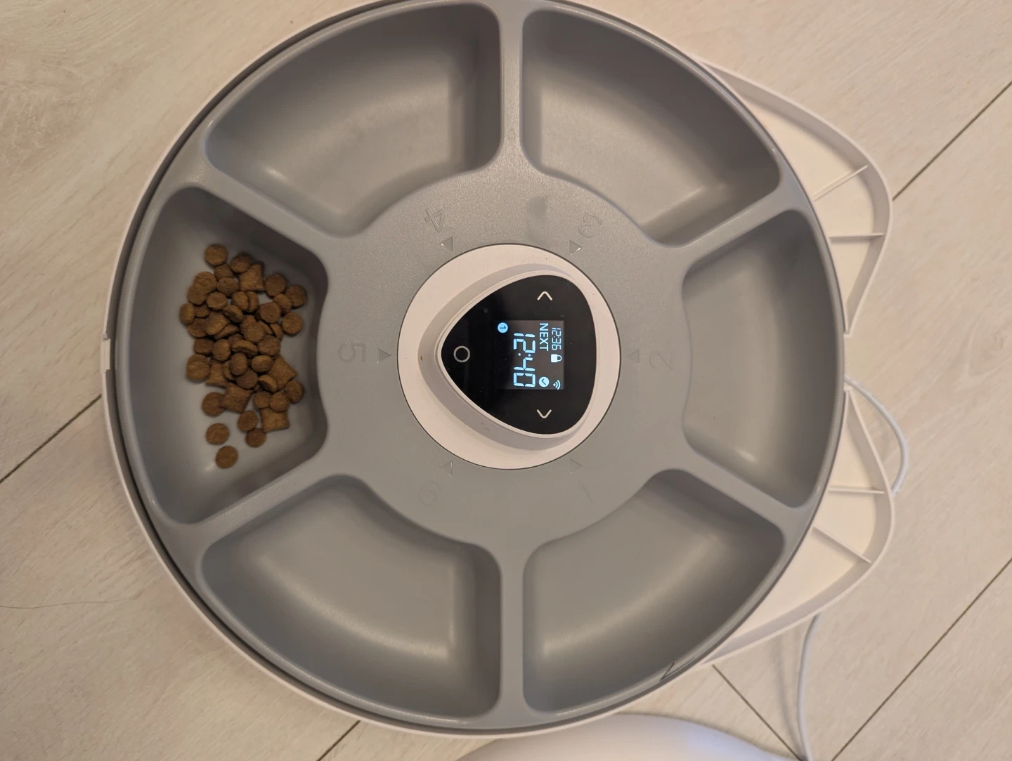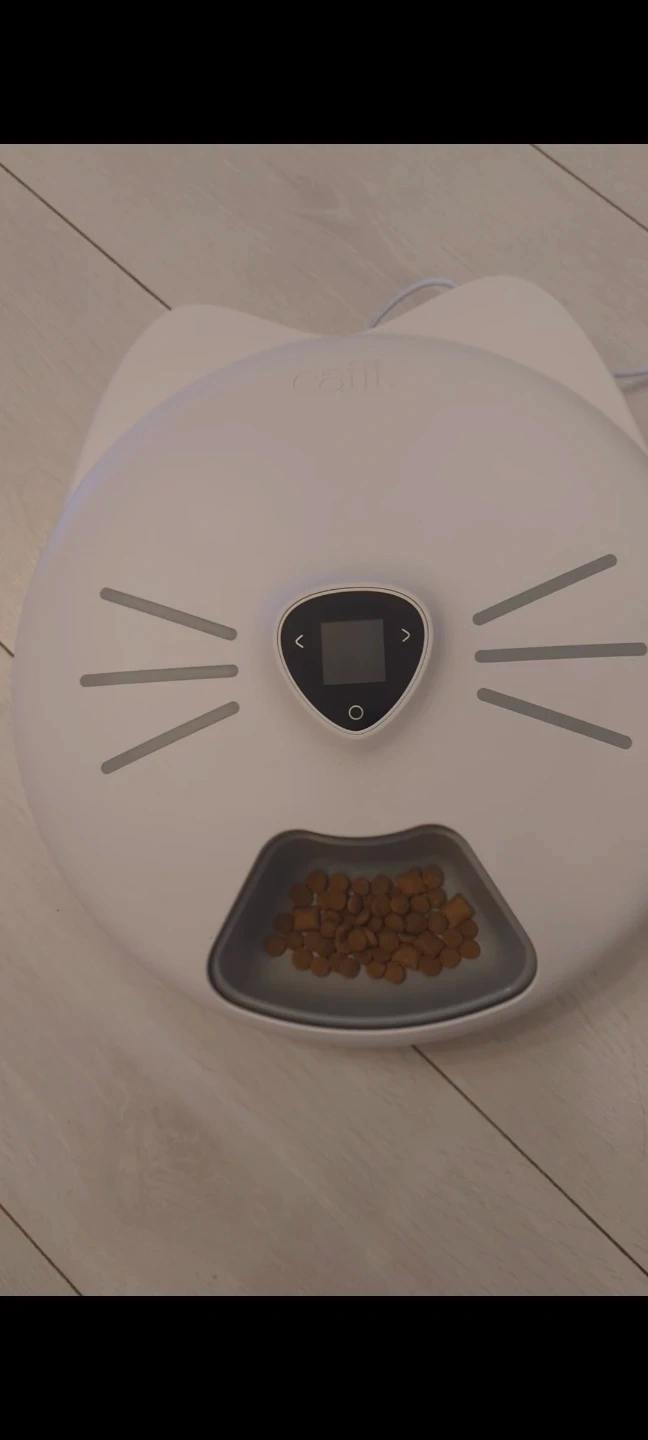 This Catit Pi smart food feeder has six meals to help keep your pet fed. It comes with the unit, tray, lid, and USB charger. It's a great way to portion out food for your cat or small dog!