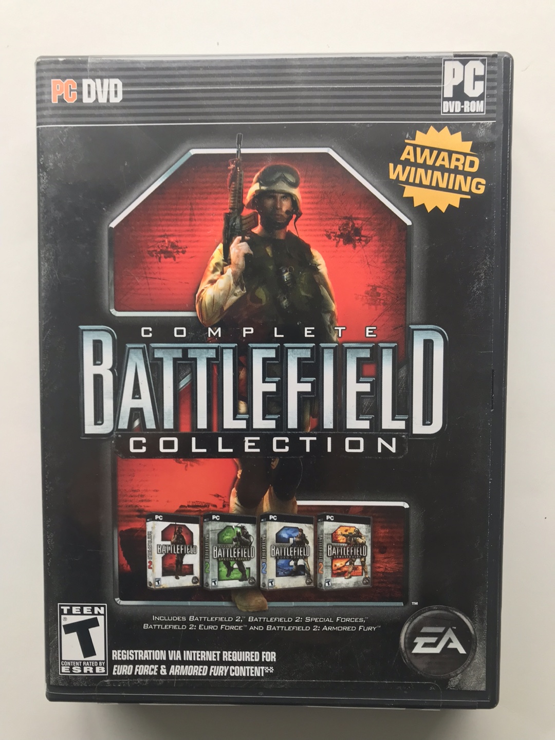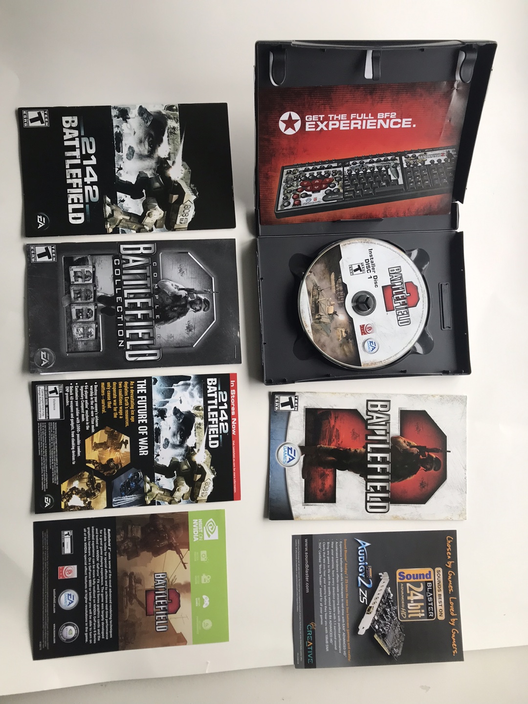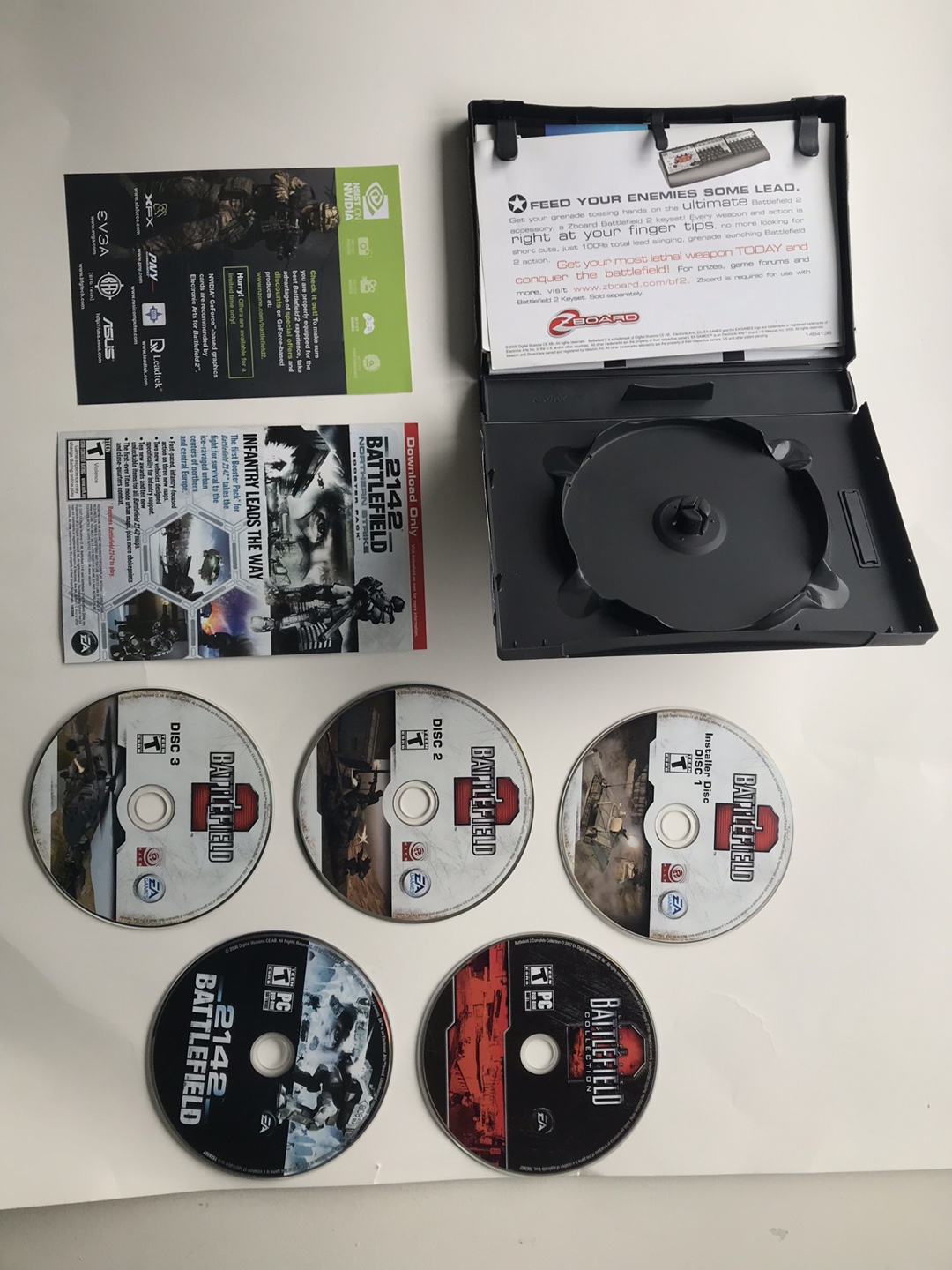 Complete Battlefield Collection for PC, includes Battlefield 1942, Battlefield 2, Battlefield 2142, Battlefield Vietnam, and Battlefield: Modern Combat. All games are on disc and come with manuals. Keys are not included.
