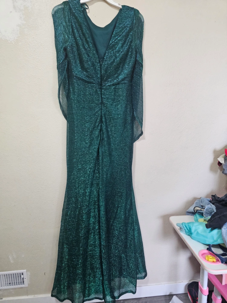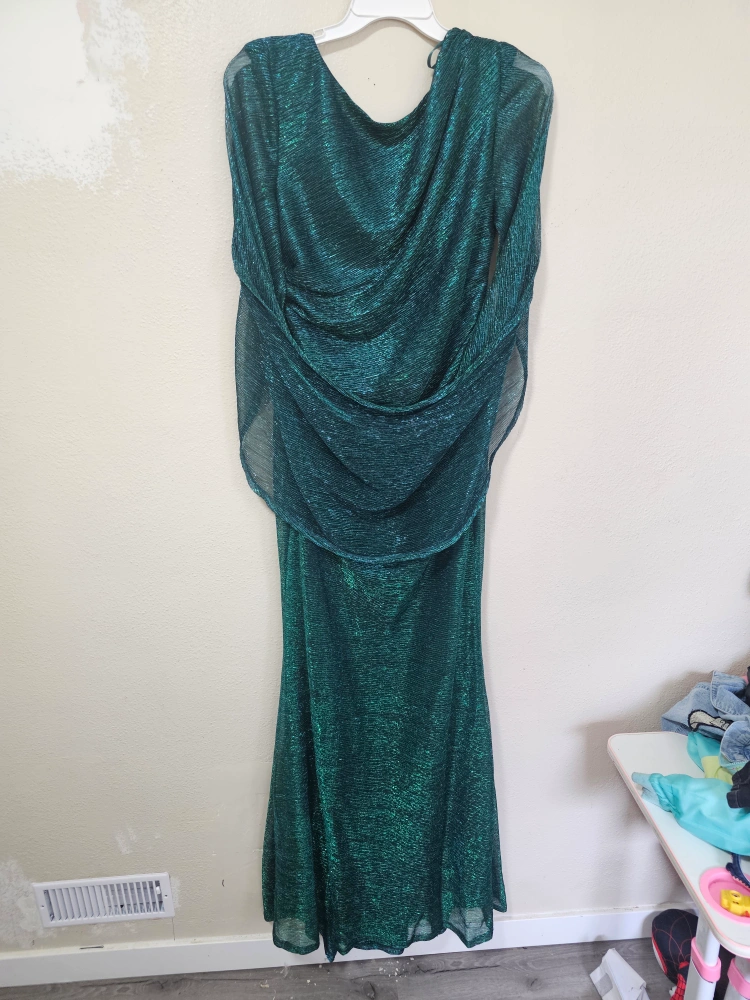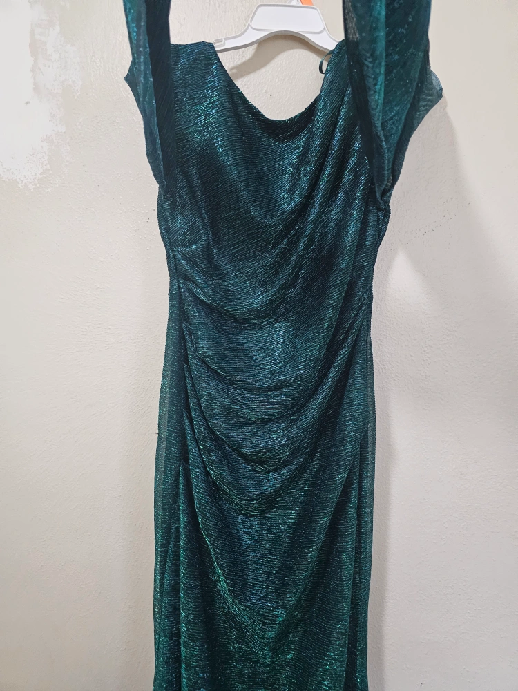 Selling a beautiful emerald green formal gown. It has a lovely draped design and a shimmering texture. Perfect for a special occasion!