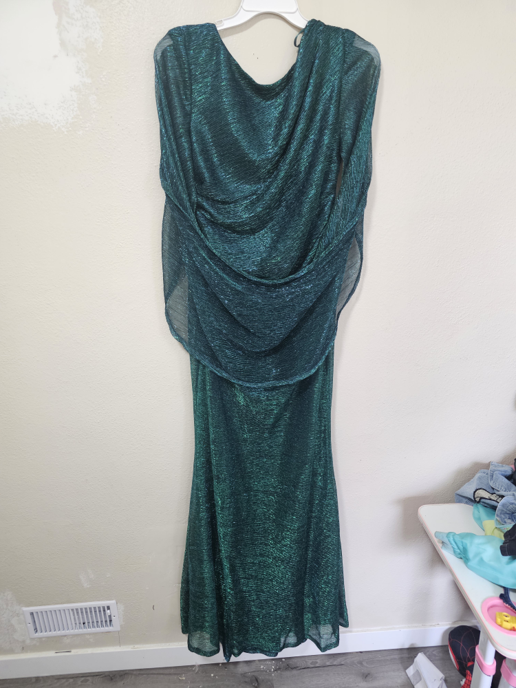 Selling a beautiful emerald green formal gown. It has a lovely draped design and a shimmering texture. Perfect for a special occasion!