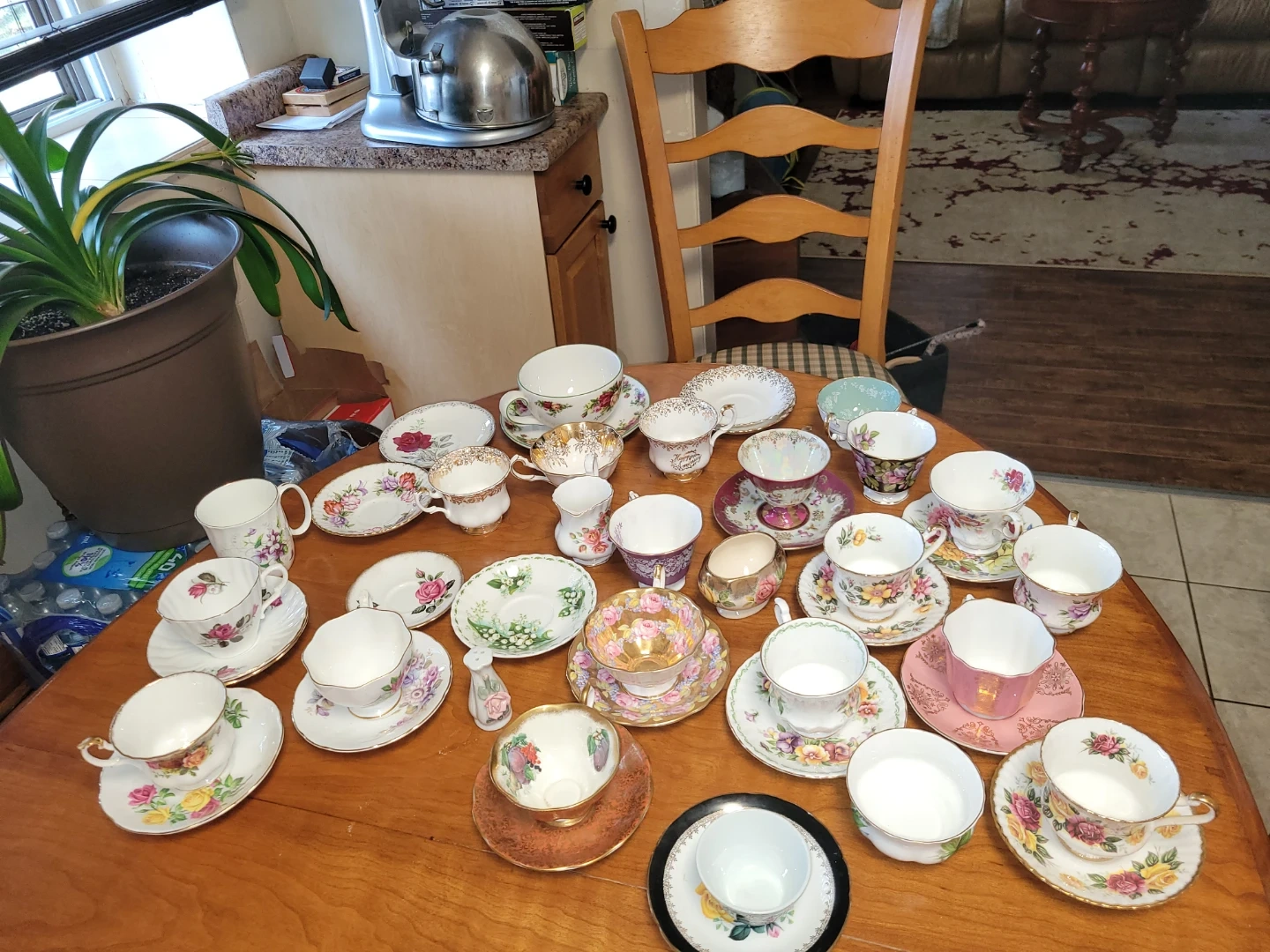 A lovely collection of vintage teacups and saucers, featuring assorted floral patterns. Some pieces are marked 'Royal Albert'. This set would be wonderful for hosting afternoon tea parties. It's a charming addition to any kitchen or display cabinet!