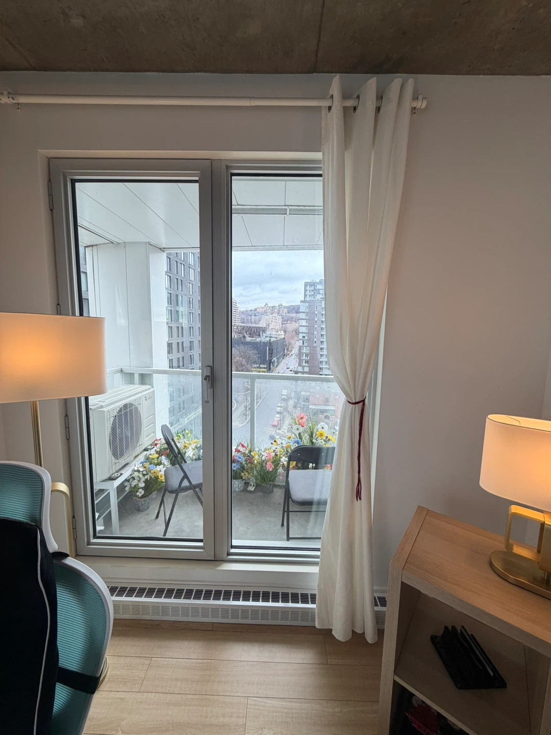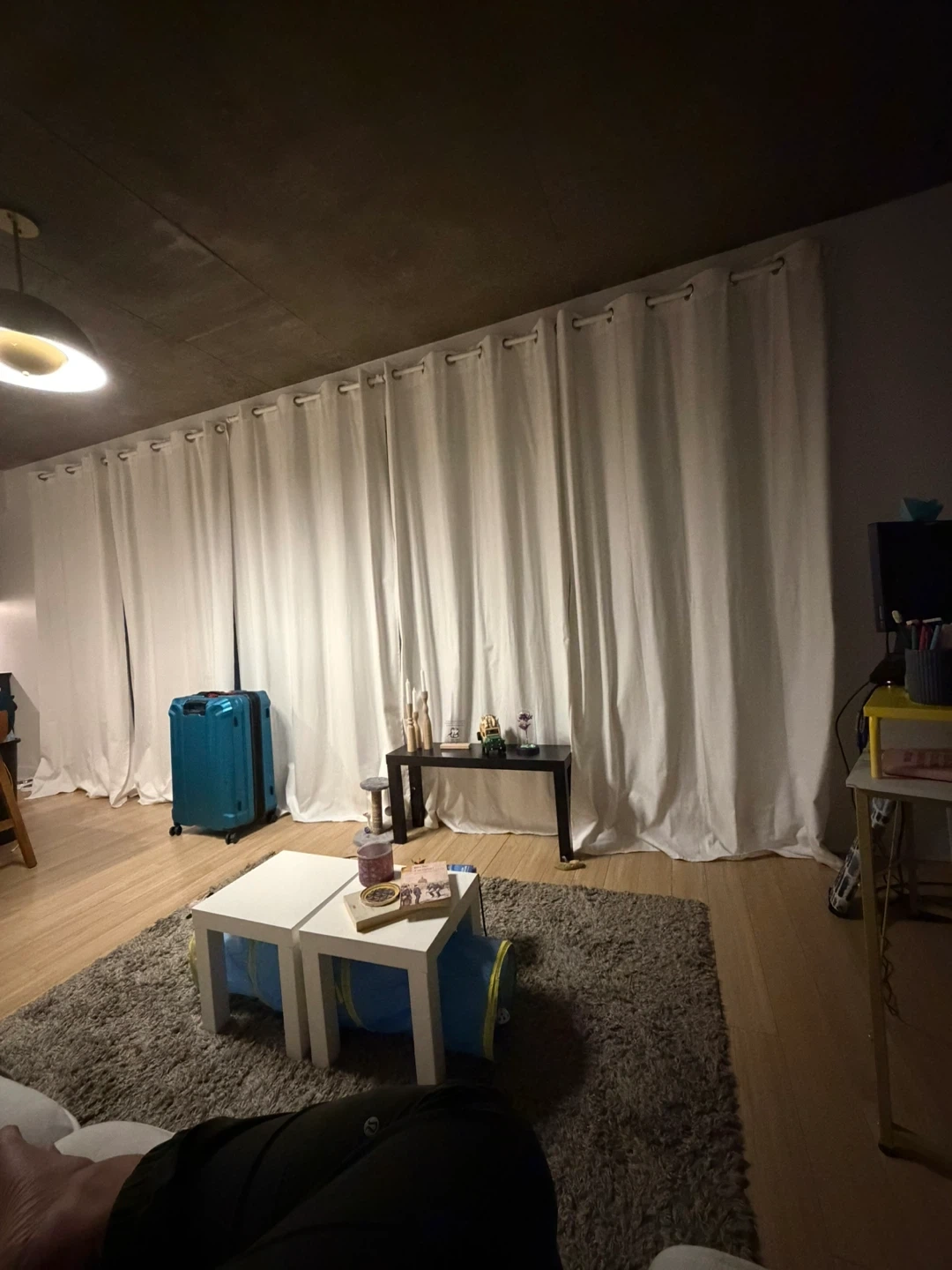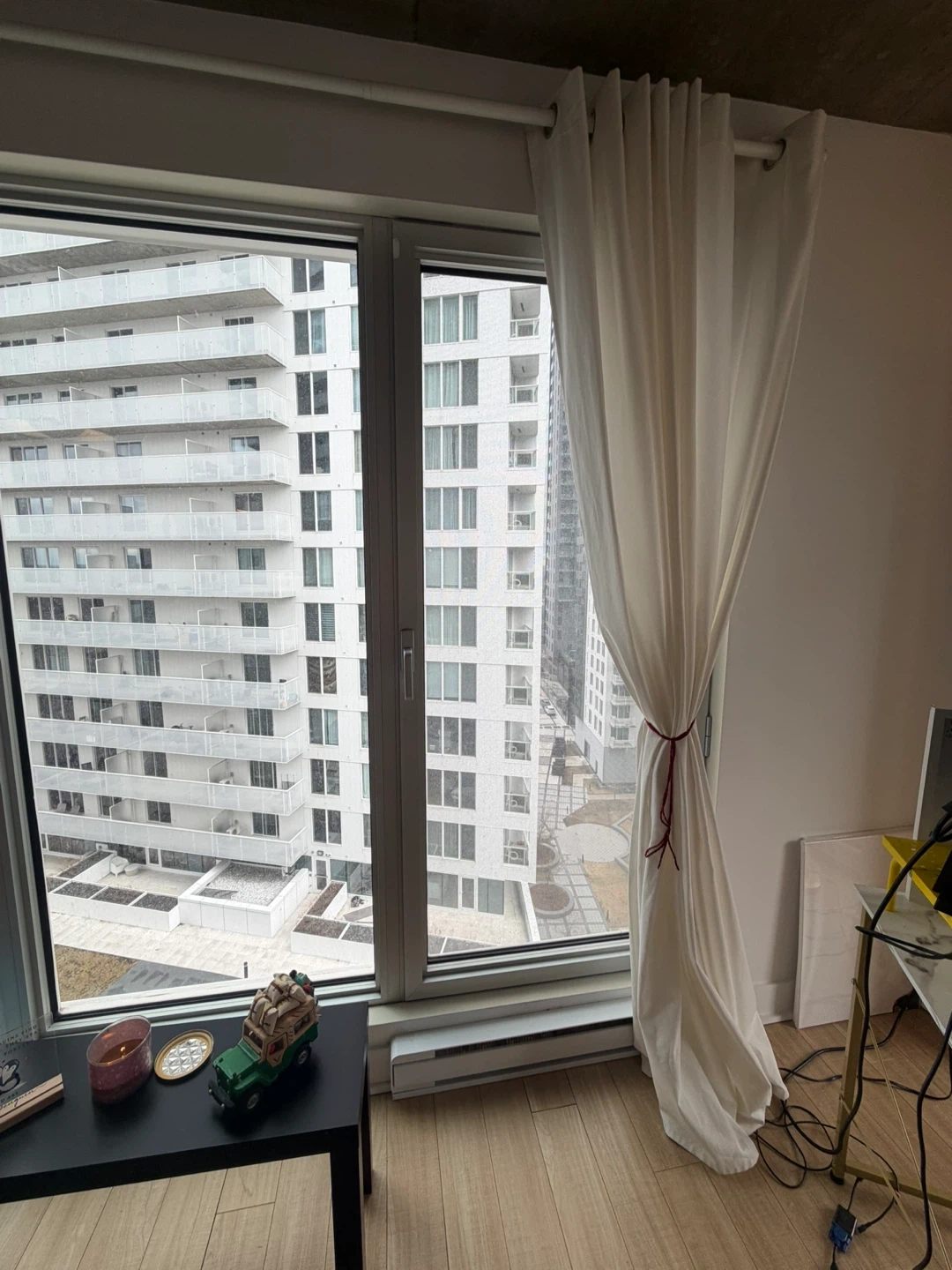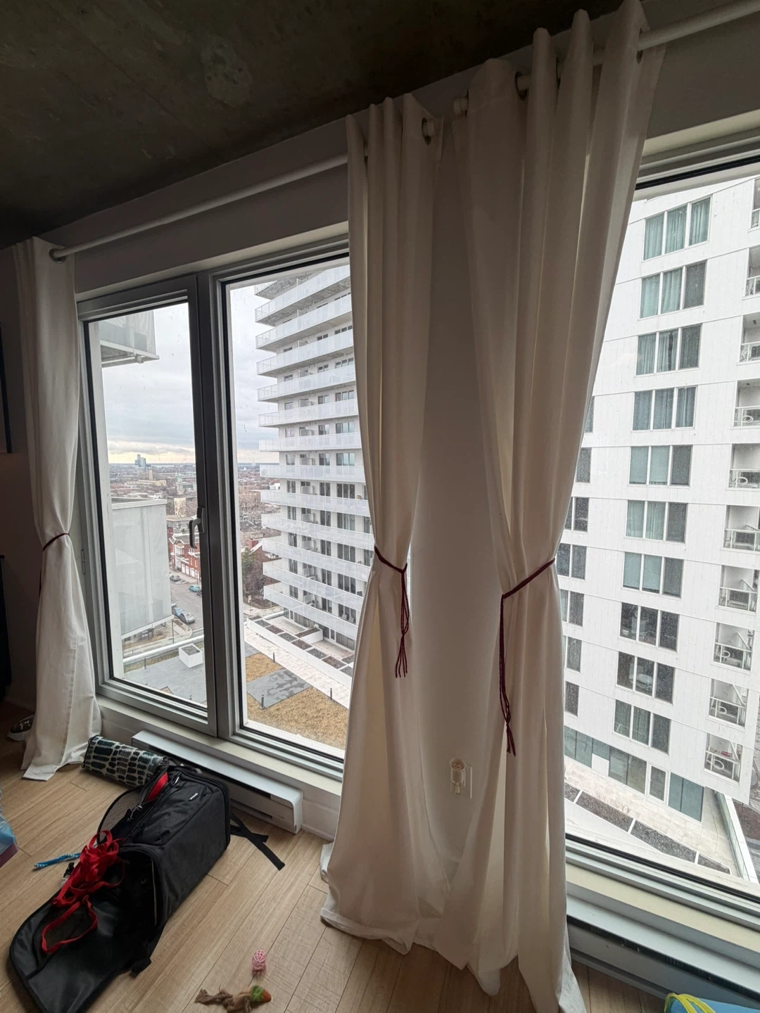 Set of white curtains that can be tied back. They're for a large window or sliding door. Fabric material.