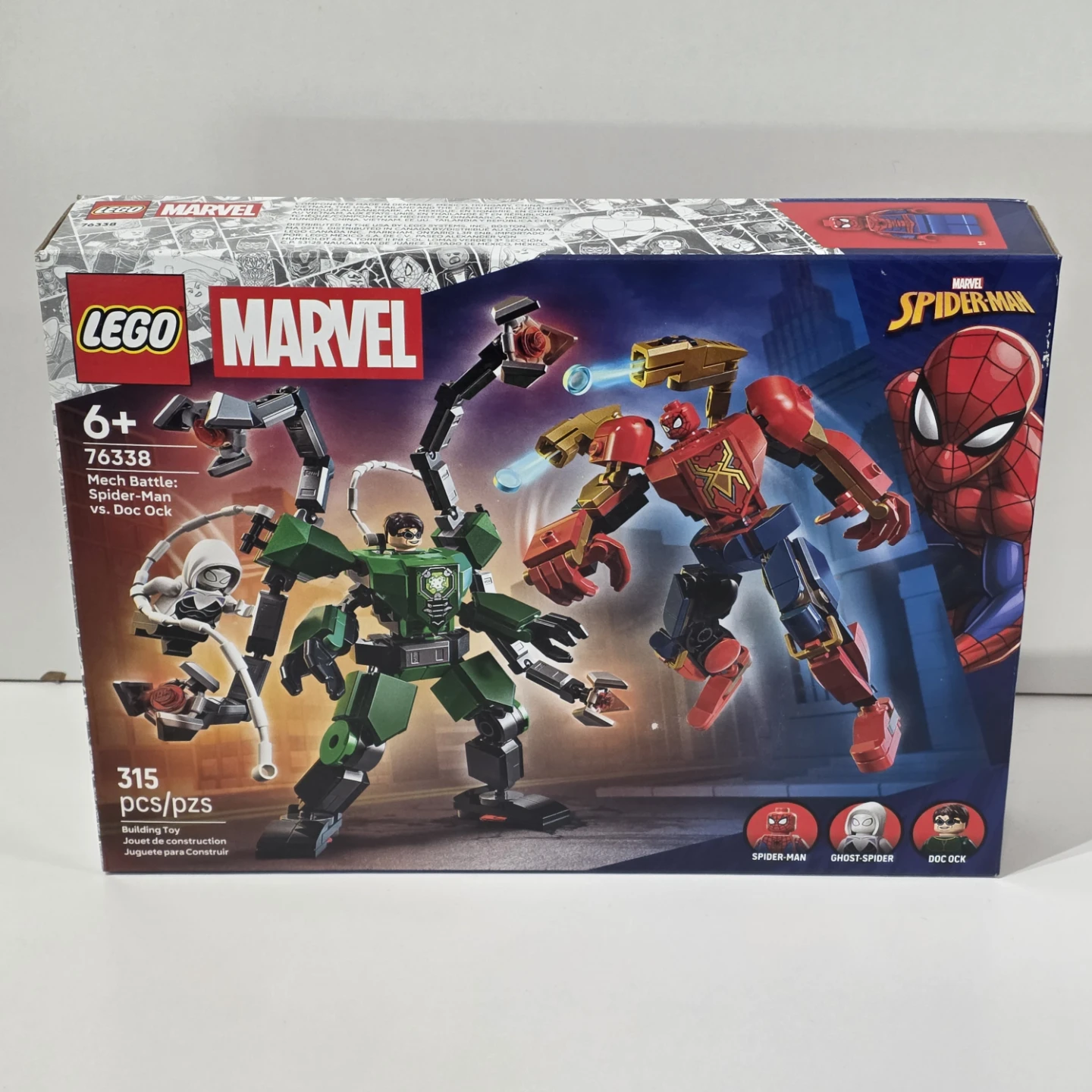 LEGO Marvel set featuring Spider-Man, Ghost-Spider, and Doc Ock. It has 315 pieces and is a building toy for ages 6+! This set is great for young builders who love Marvel superheroes.