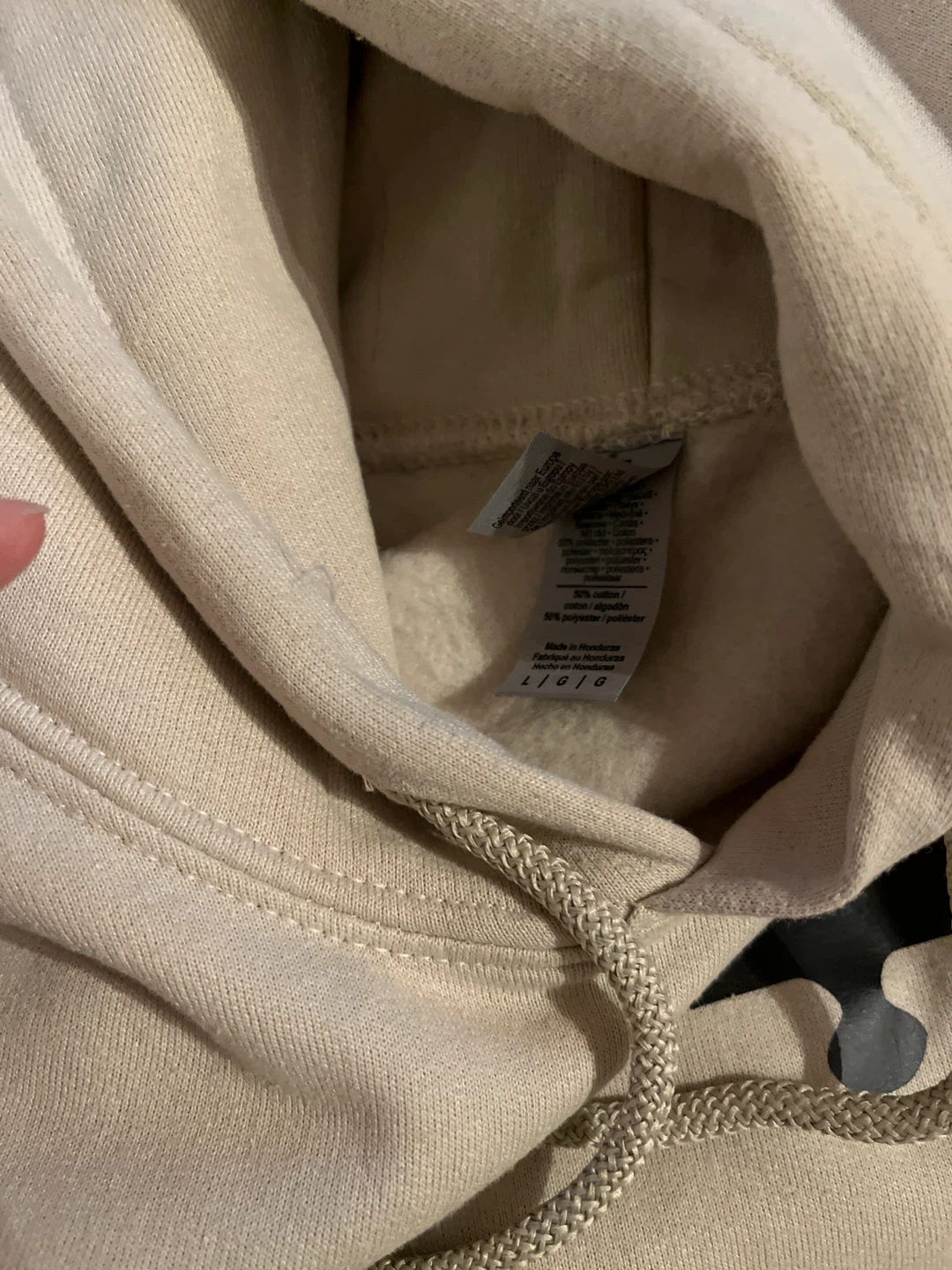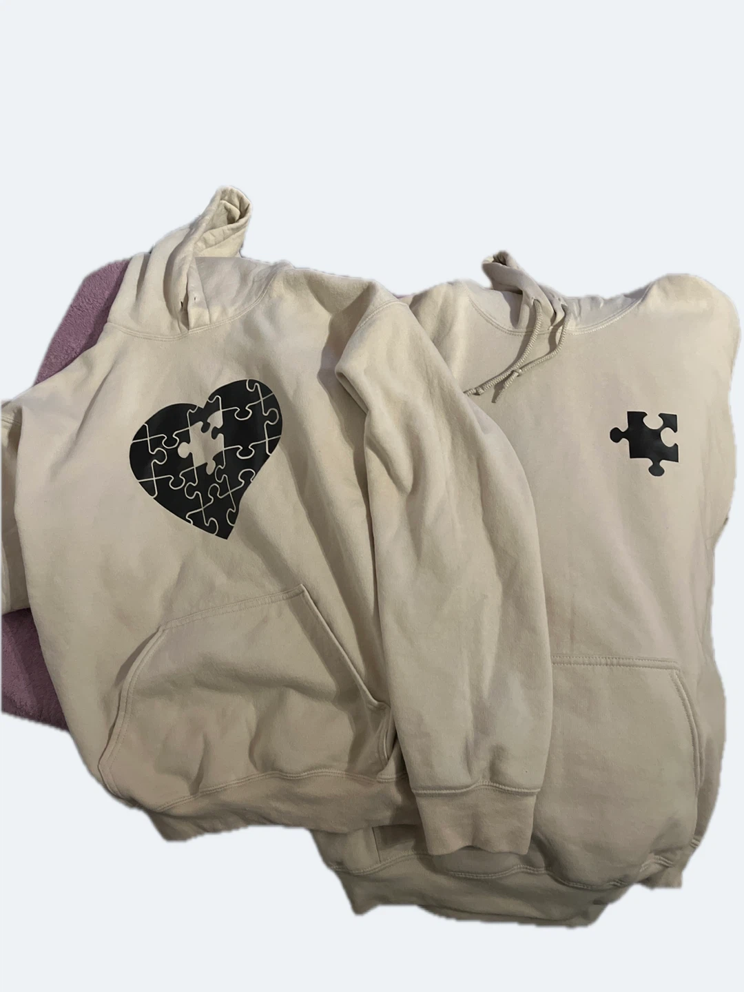 Two beige couple’s hooded sweatshirts.