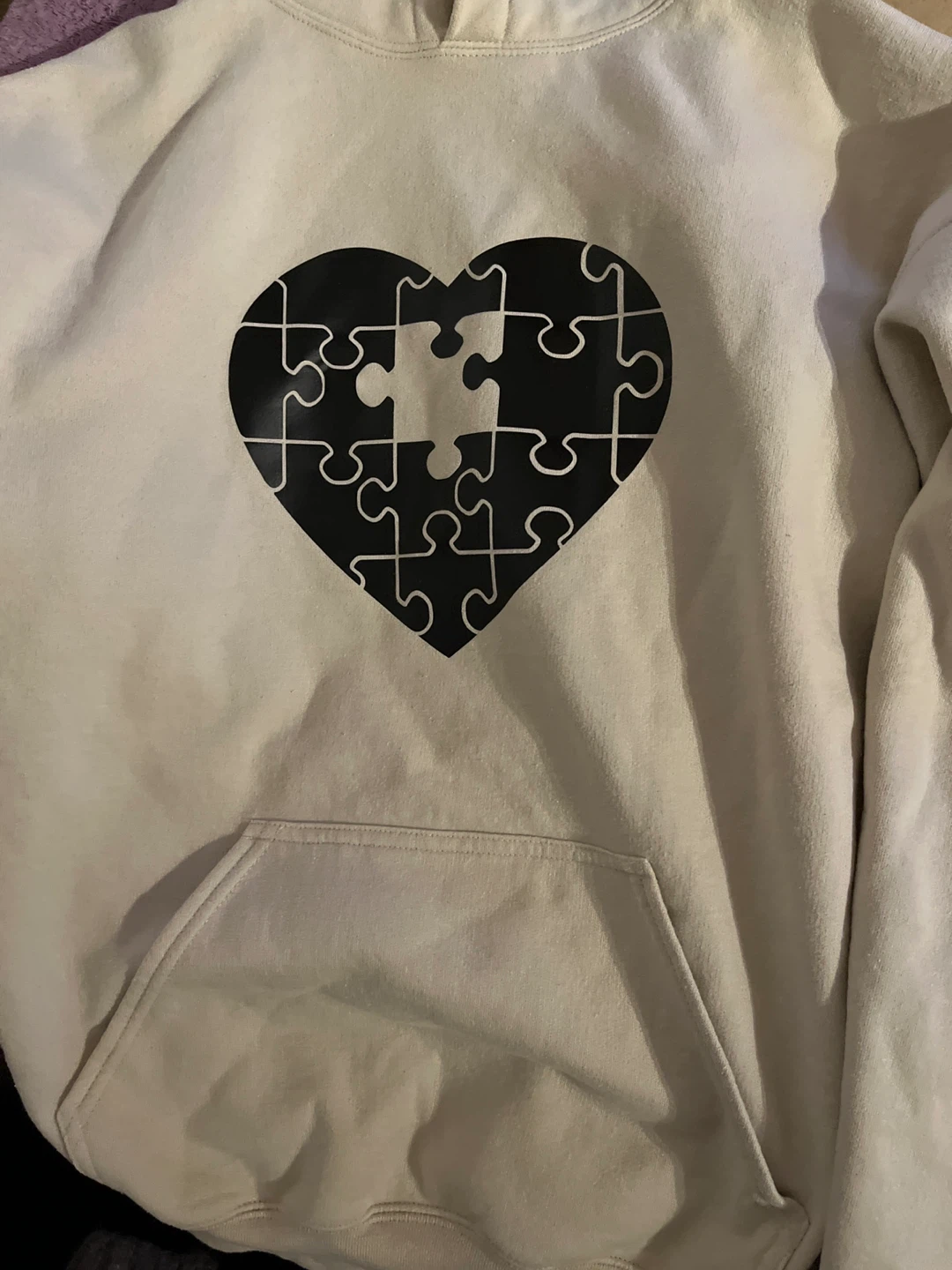 One features a large black puzzle heart graphic on the front (size medium) The other has a small black puzzle piece graphic on the chest (sir large)