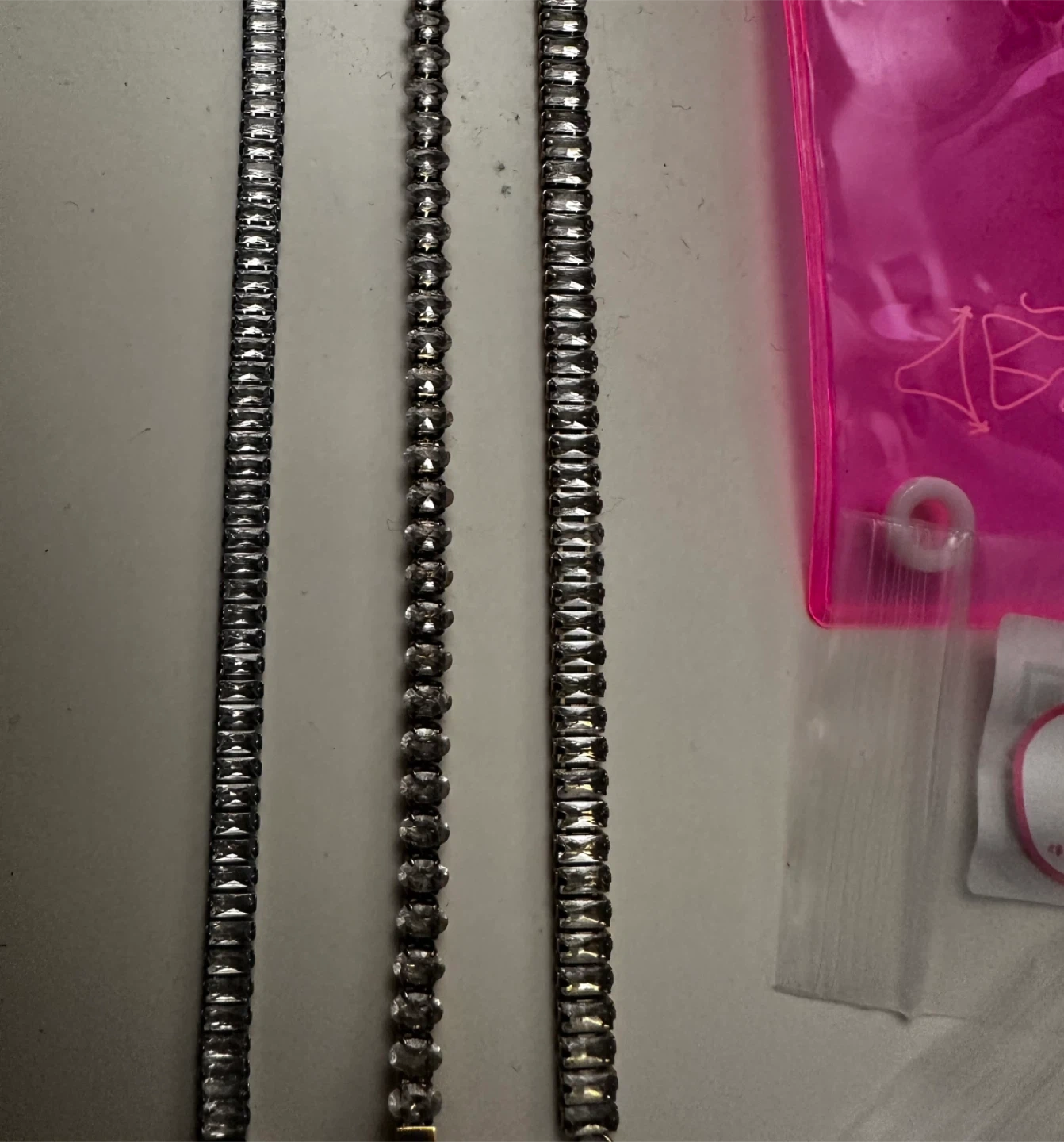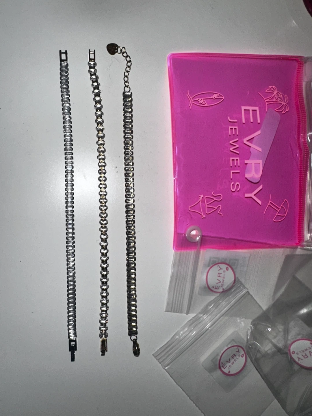 Three sparkly tennis bracelets from EVRY JEWELS. Features two baguette-cut styles and one round-cut style. Includes a pink pouch for storage.