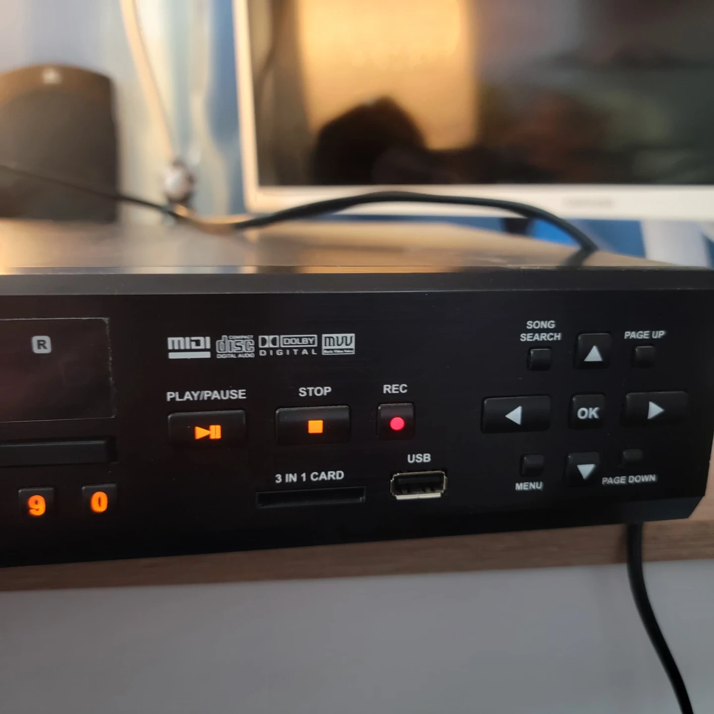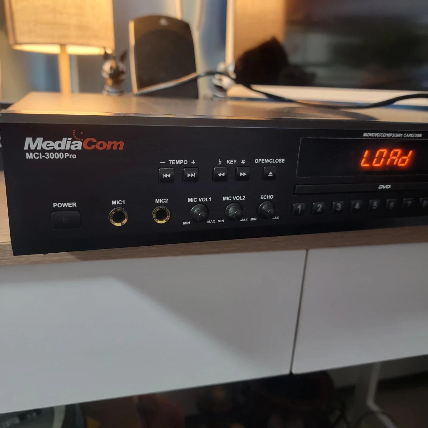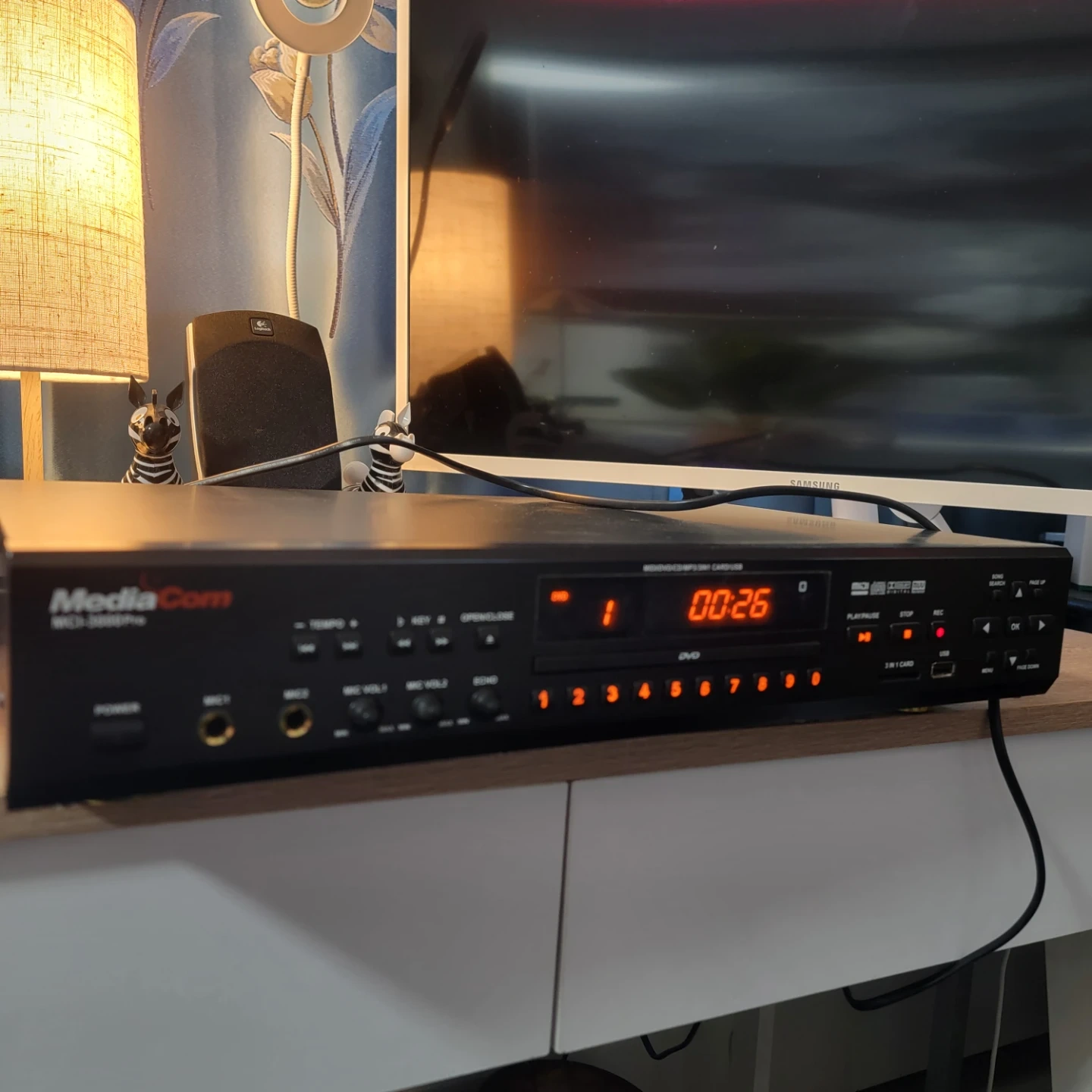 This MediaCom MCI-3000 karaoke machine plays DVDs and CDs. It has USB and 3-in-1 card slots for media playback. Supports MIDI and Dolby Digital formats.