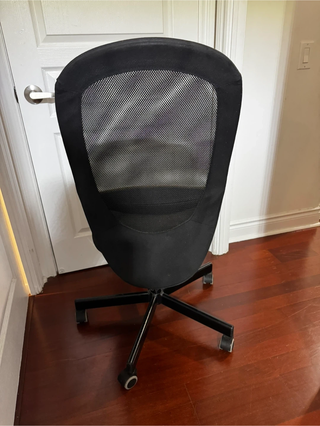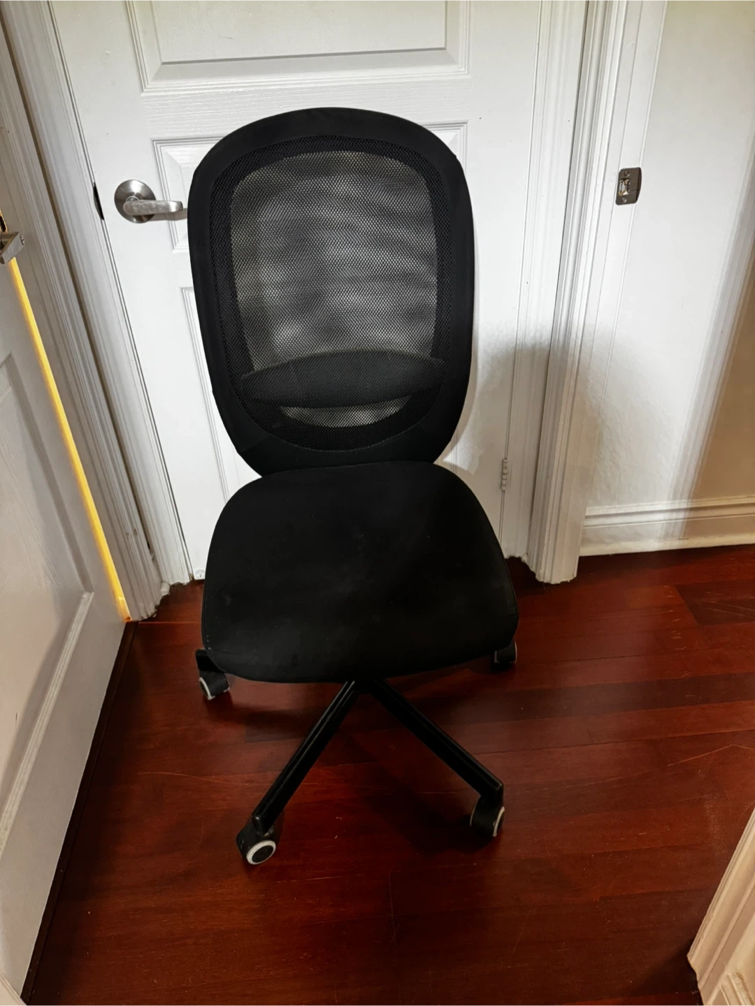 Adjustable black office chair in good condition. It features a mesh back for breathability and a comfortable seat. Perfect for your home office or study space!