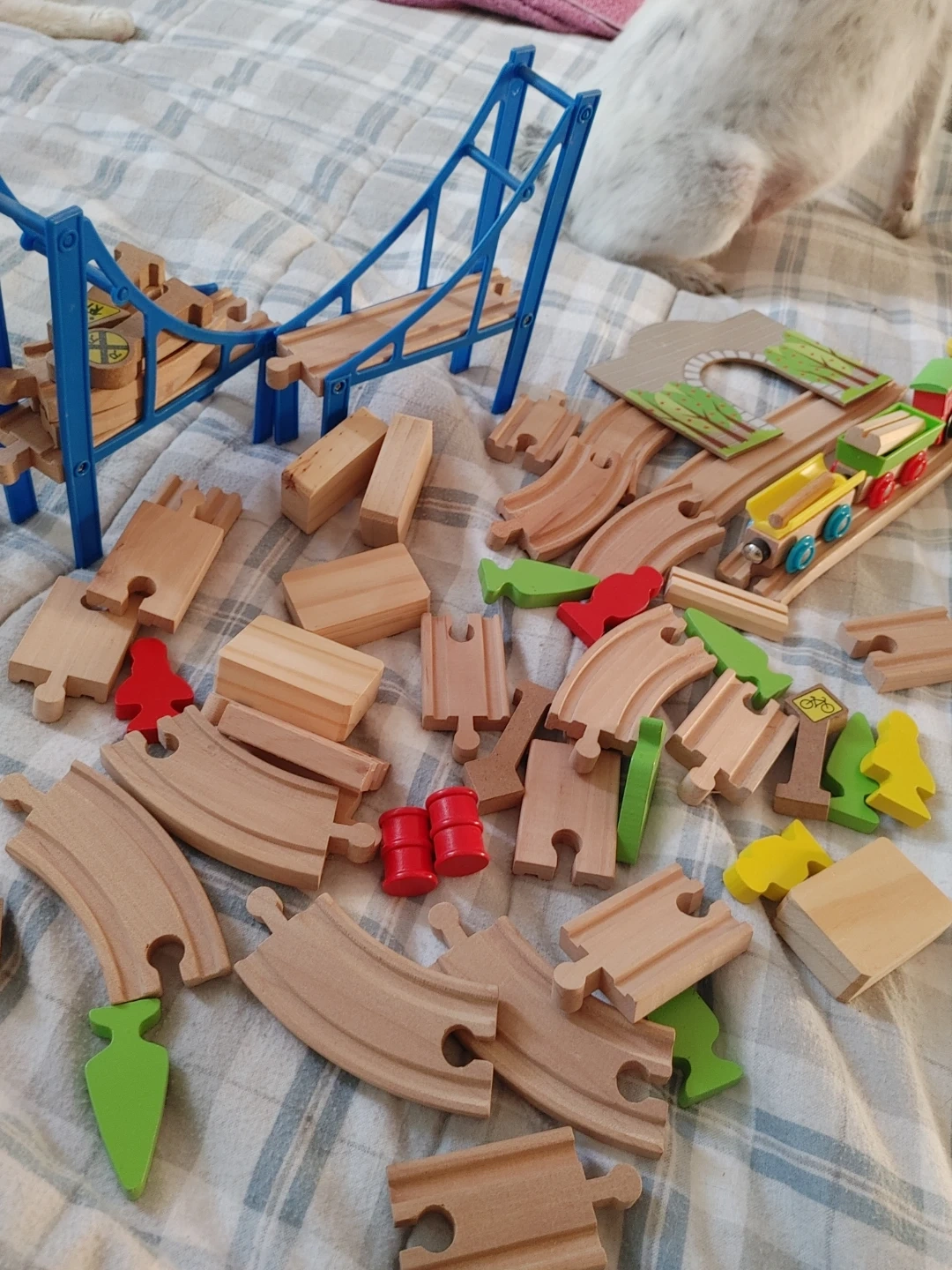 A fun wooden train track set with lots of pieces, including curved and straight tracks, a bridge, and small train cars. It's got trees, signs, and little red barrels too. Great for imaginative play!