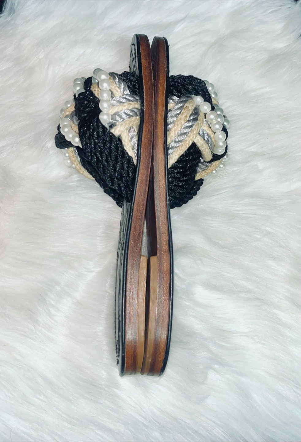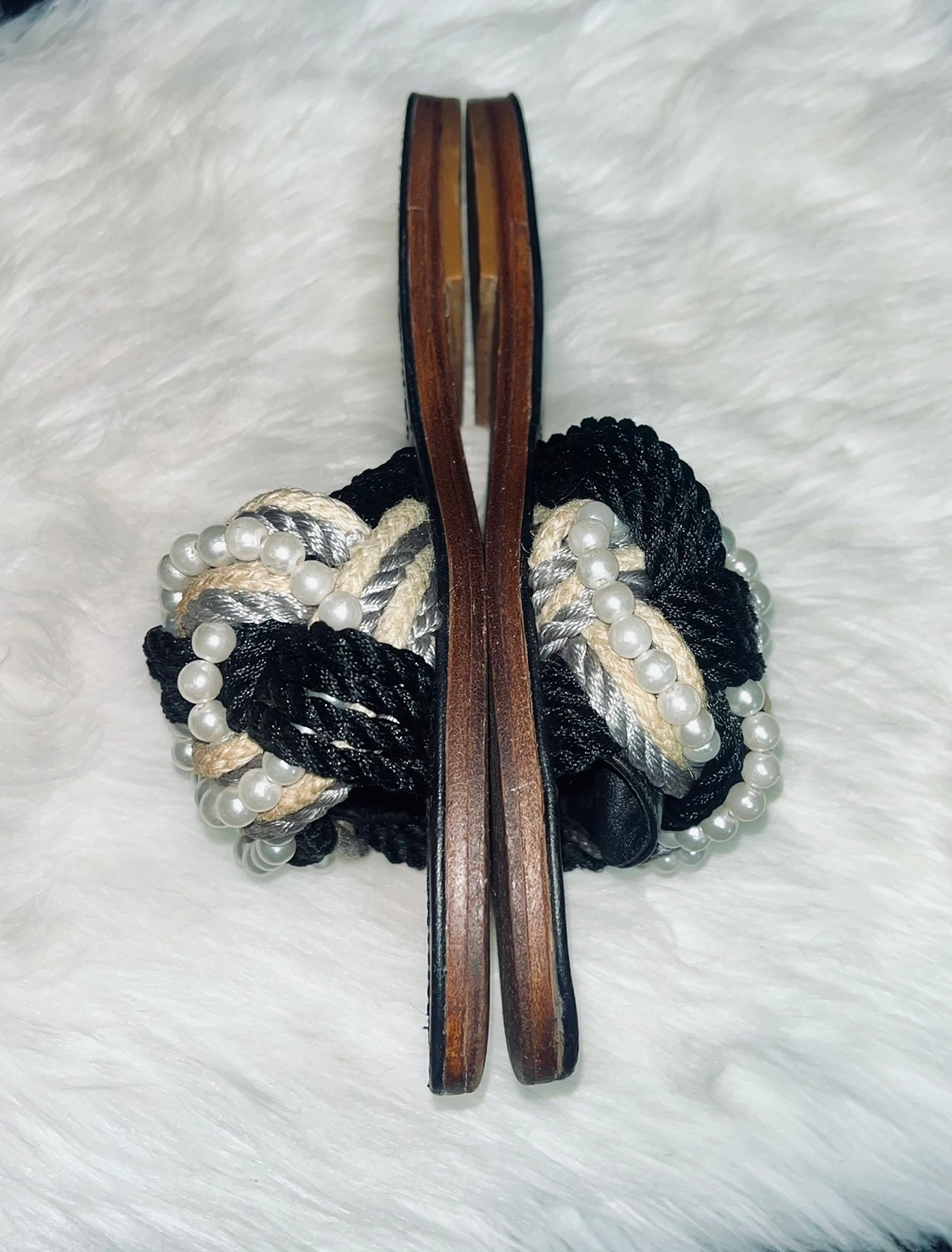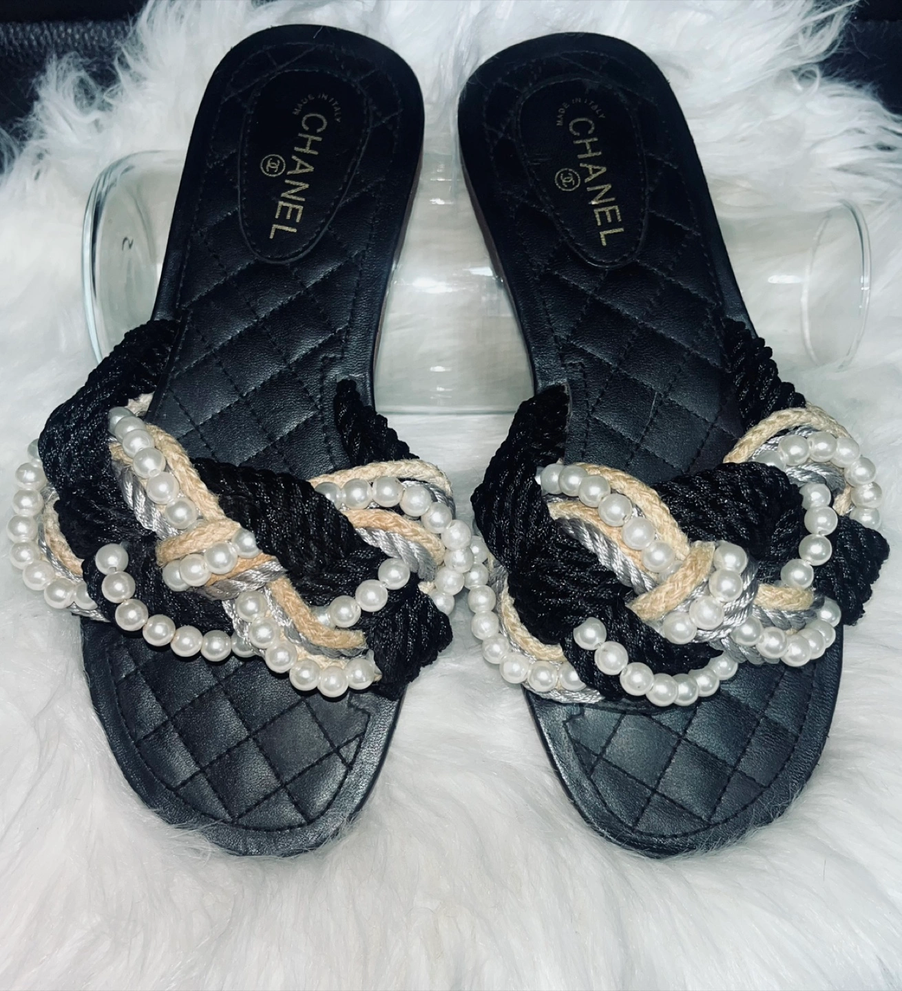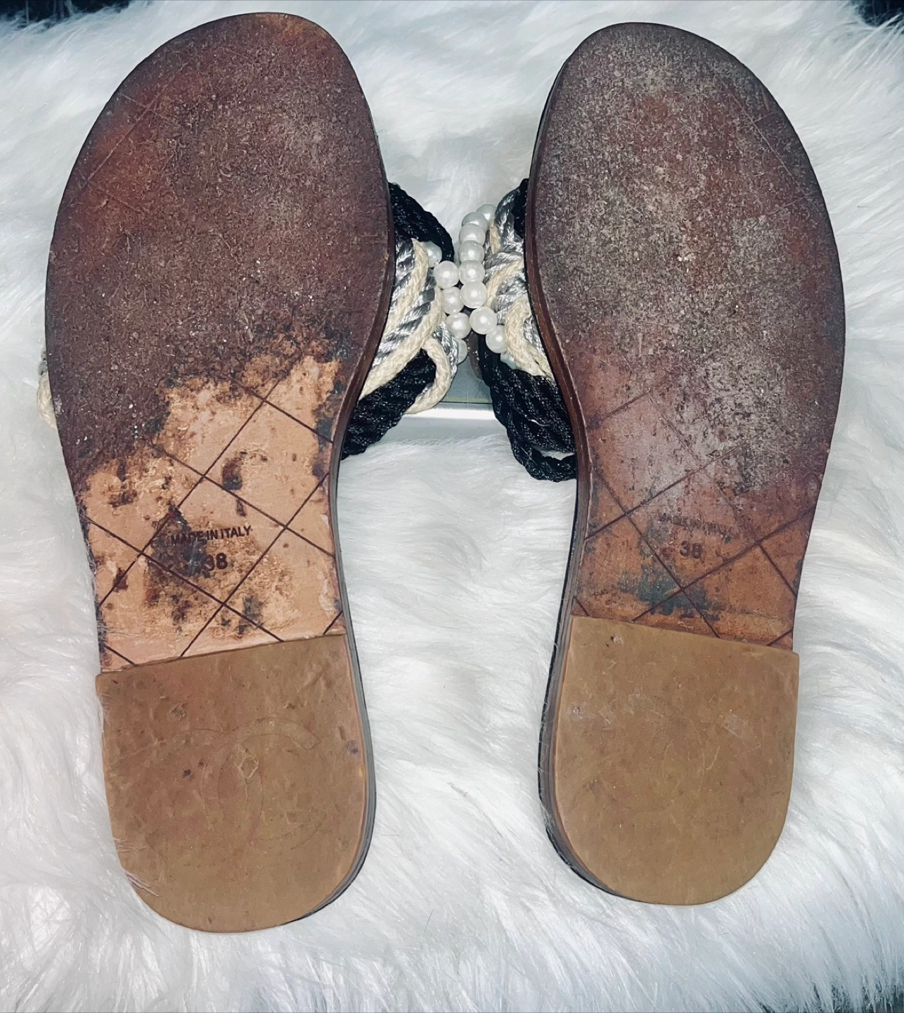 Selling a pair of authentic Chanel leather mules. They feature a black quilted footbed and a decorative woven design with pearl embellishments. The size is 38.