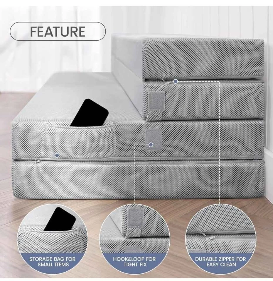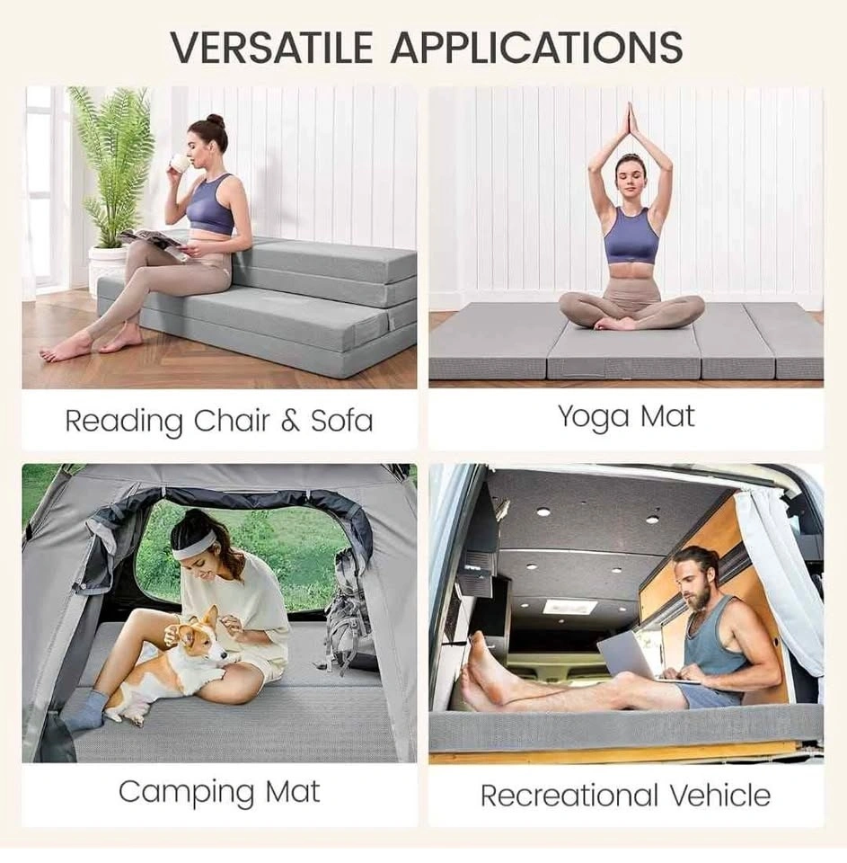 This is a 4-inch thick, queen-size, four-fold mattress topper. It's portable and great for travel, camping, or as a guest bed. It comes with a washable cover and a storage bag. It can also be used as a portable sofa bed for guests.