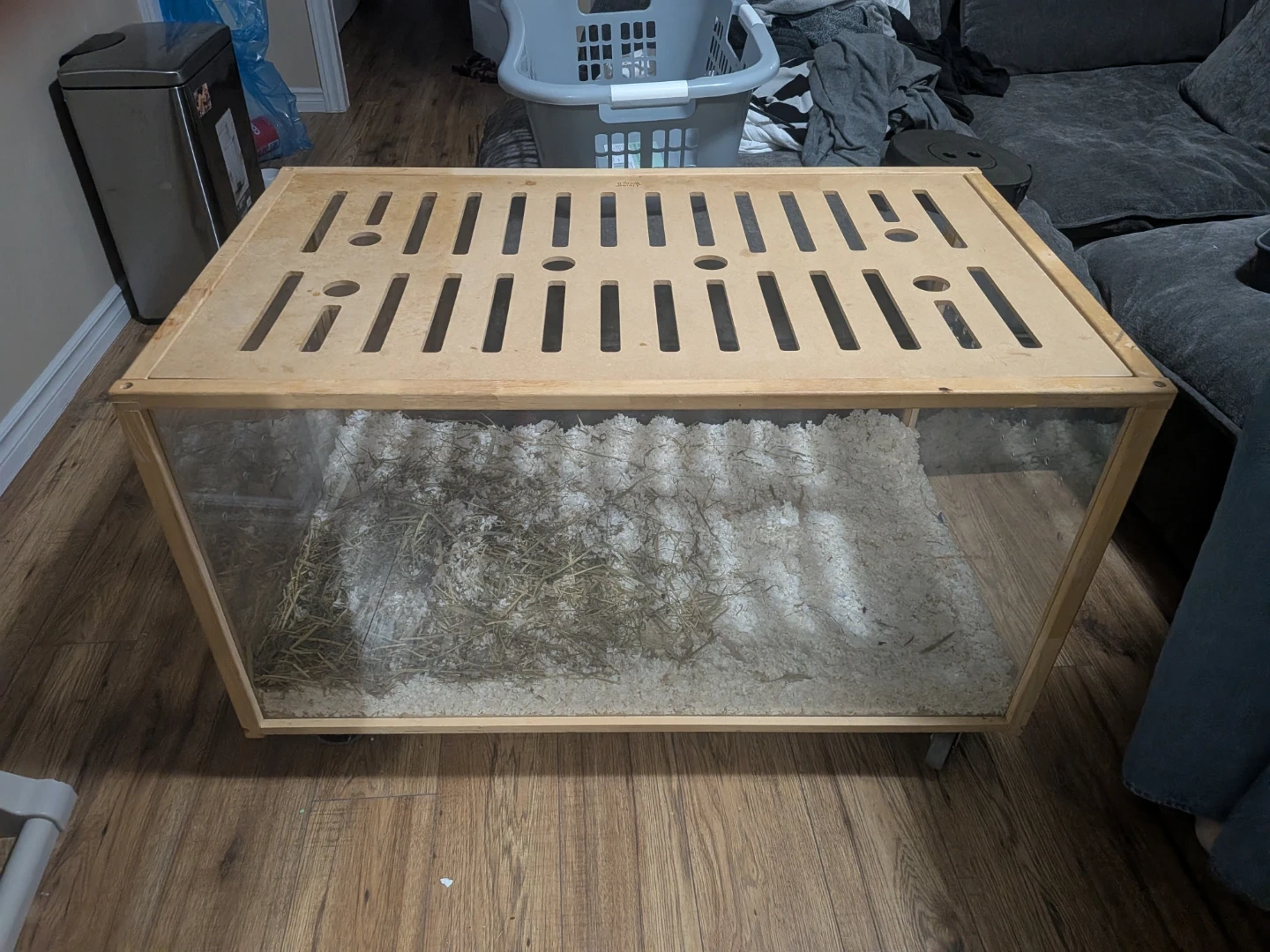 This bundle includes a wooden and plexiglass hamster cage, a large and medium exercise wheel, food, and bedding. It also comes with multiple food dishes, water bottle, and various toys and hideouts for your small pet. Everything you need to set up a comfortable habitat for your hamster or gerbil! $200 obo bedding inside is fresh can be cleaned out if wanted or left in