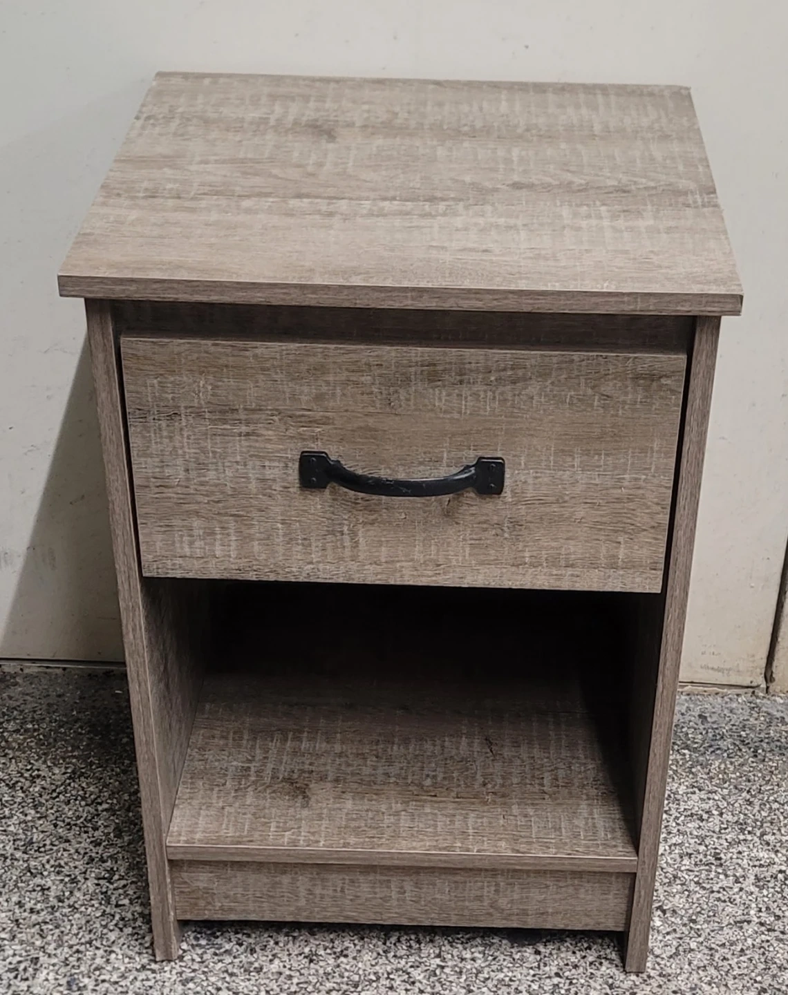 A wood grain finish nightstand featuring one drawer and an open shelf. It's great for storing essentials bedside. The drawer has a black pull handle.