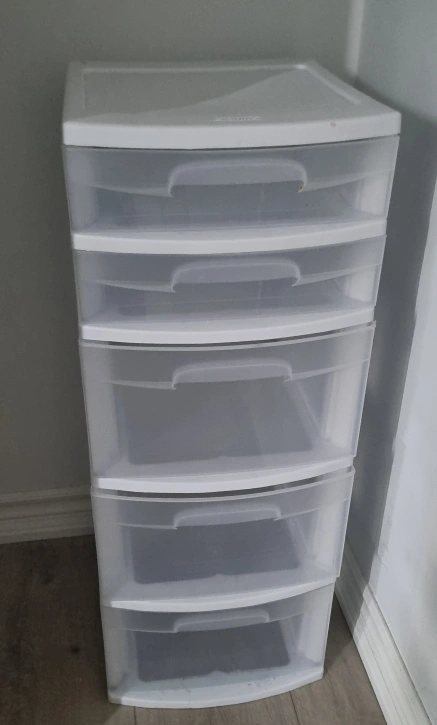 Selling a Sterilite 5-drawer wide tower in white! It's perfect for organizing your space. This tower is great for storing various items, and its wide design provides ample storage capacity