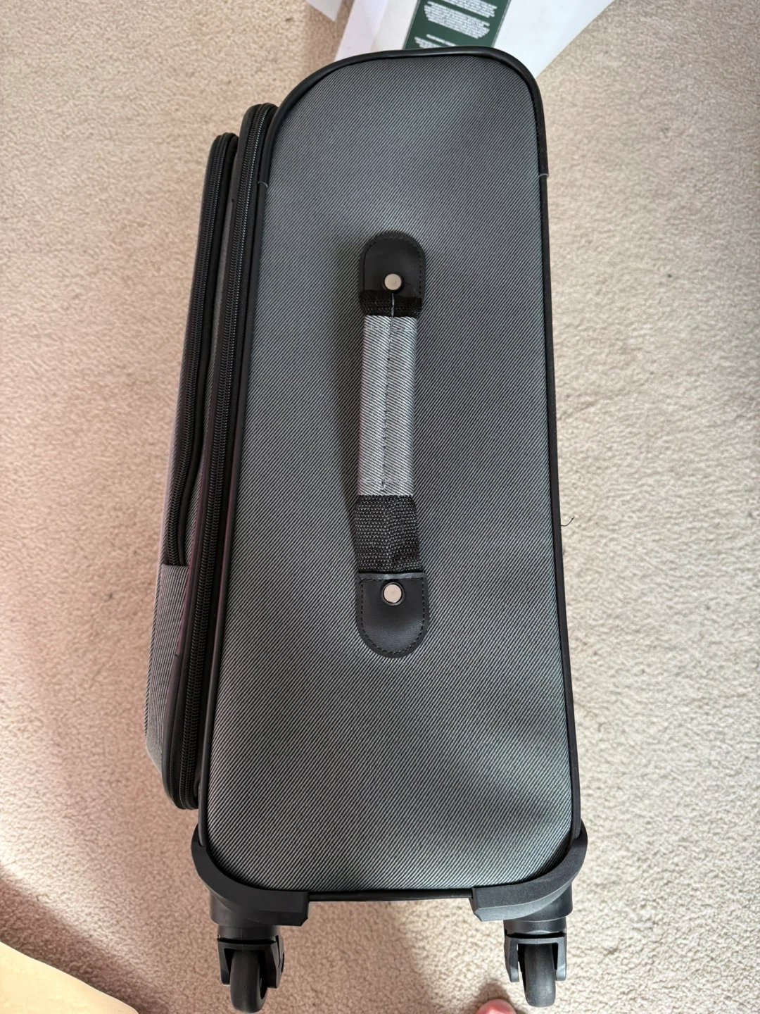 This is a grey Delsey carry-on suitcase. It features a telescoping handle and smooth-rolling wheels for easy transport. The interior has tie-down straps to secure your belongings. It's made of durable fabric.