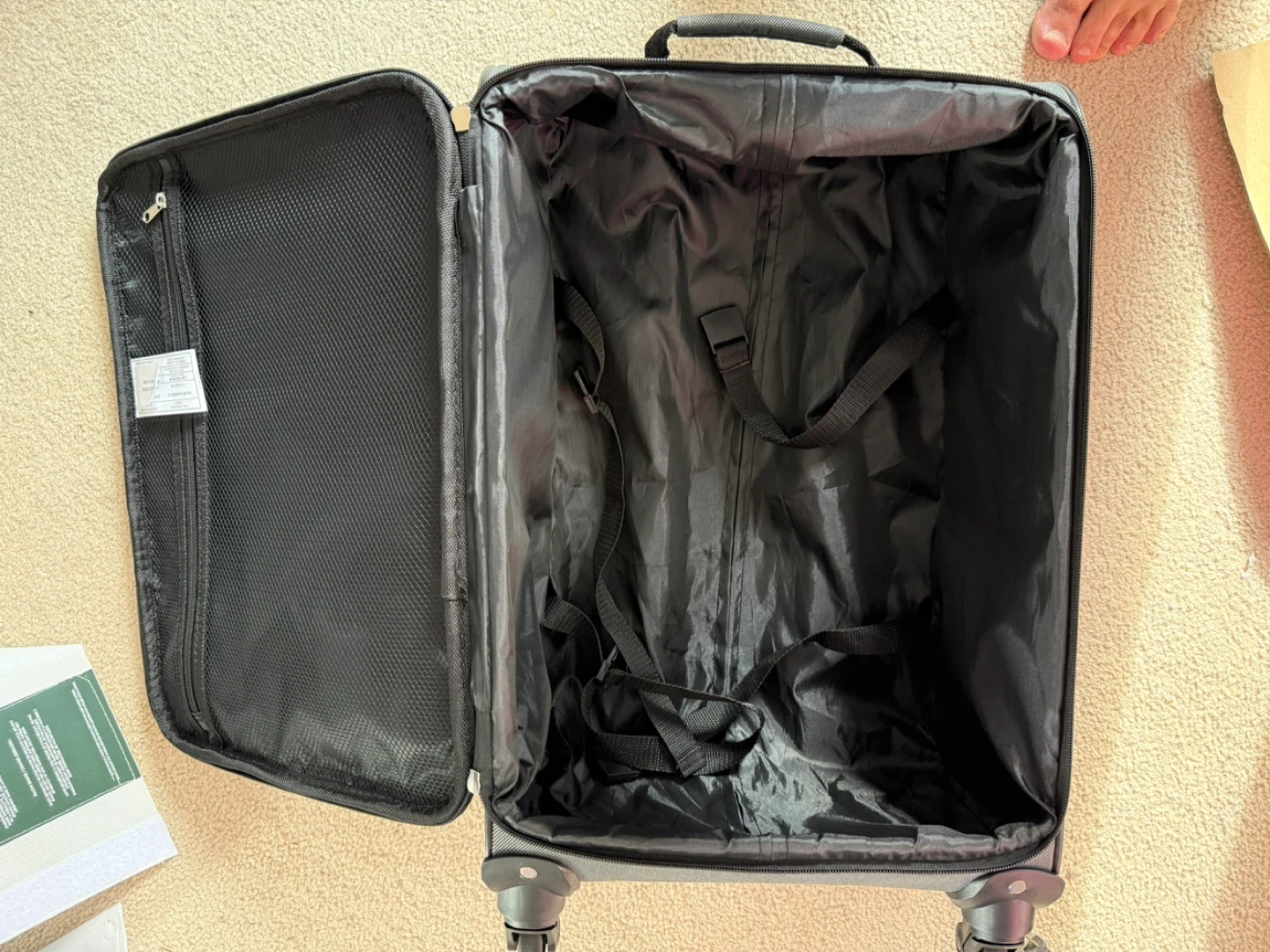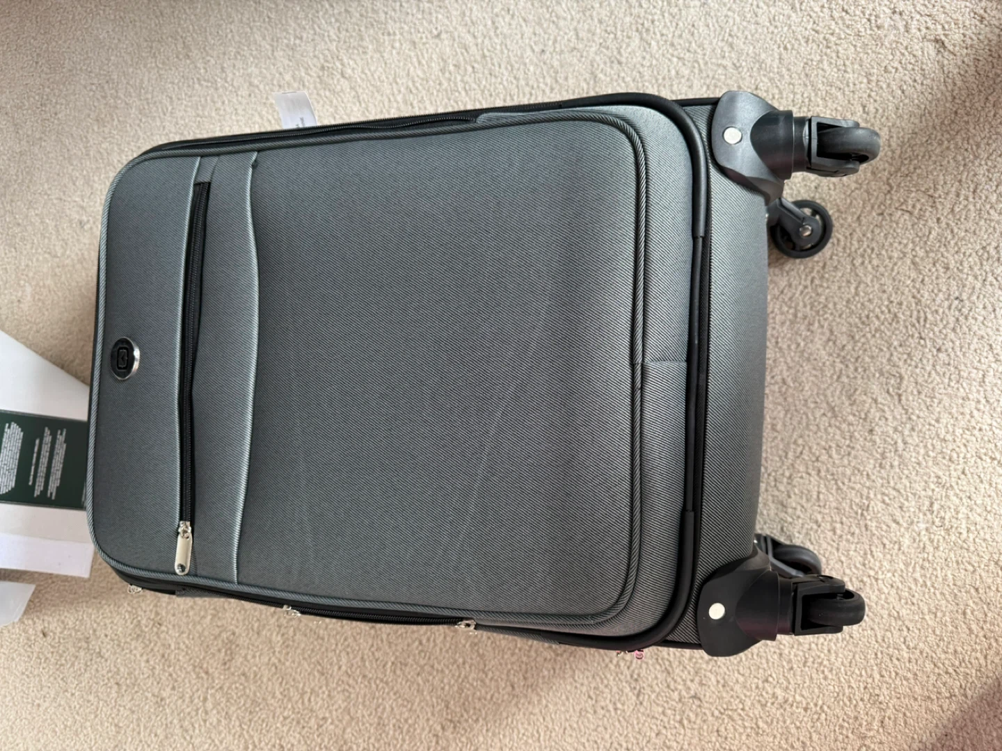 This is a grey Delsey carry-on suitcase. It features a telescoping handle and smooth-rolling wheels for easy transport. The interior has tie-down straps to secure your belongings. It's made of durable fabric.