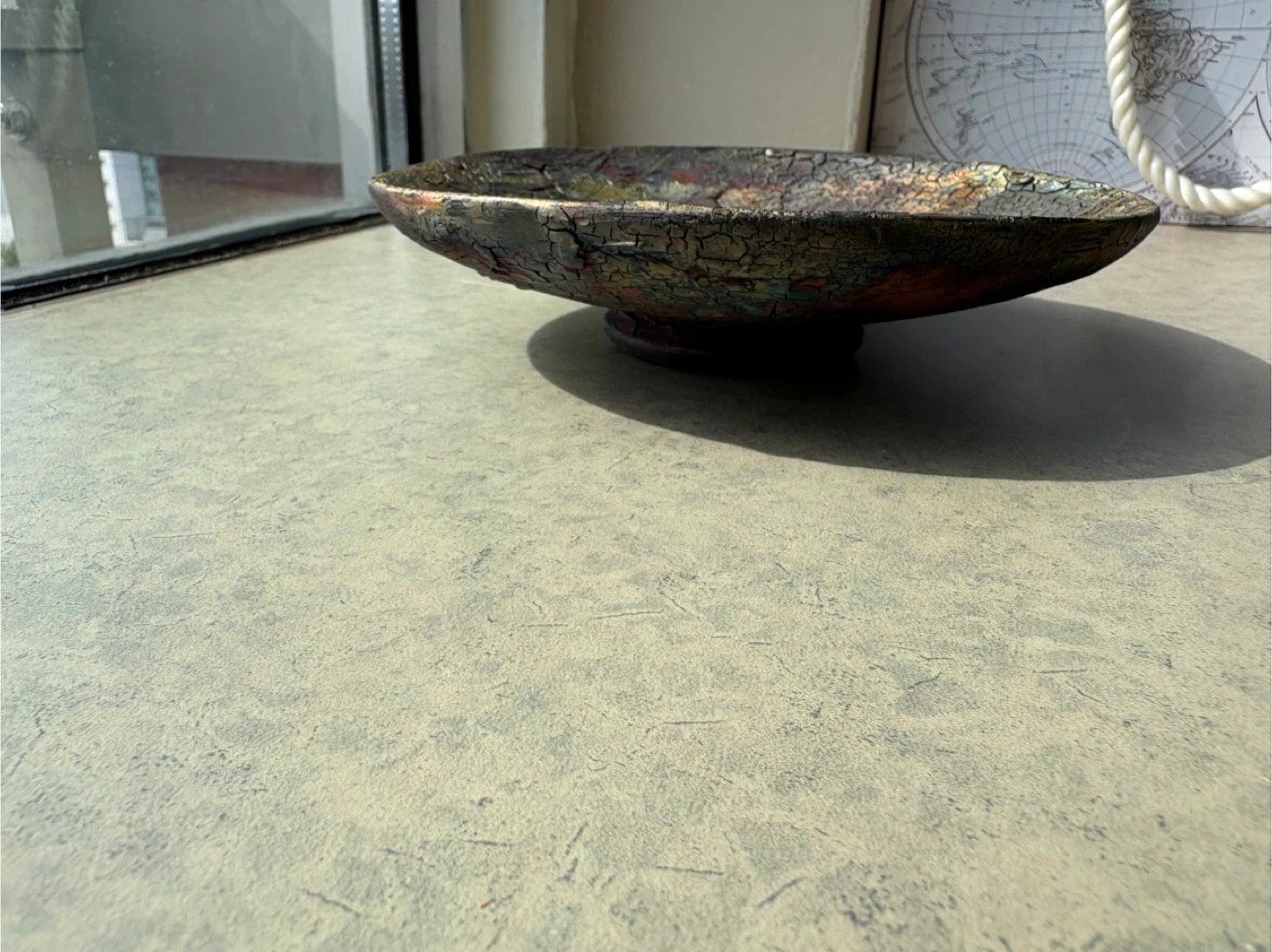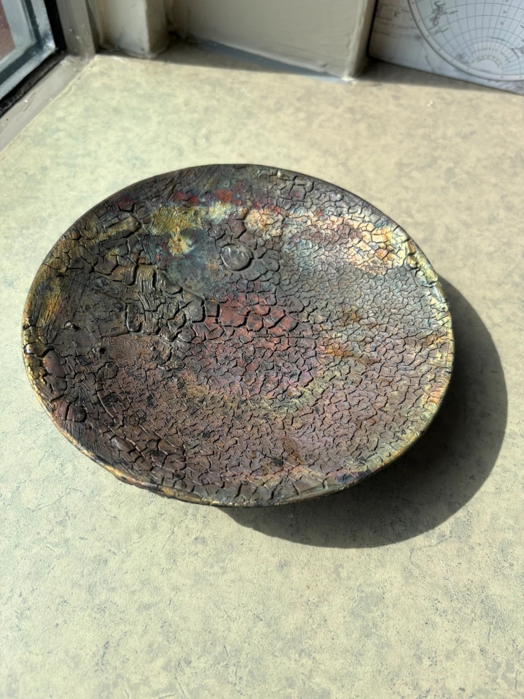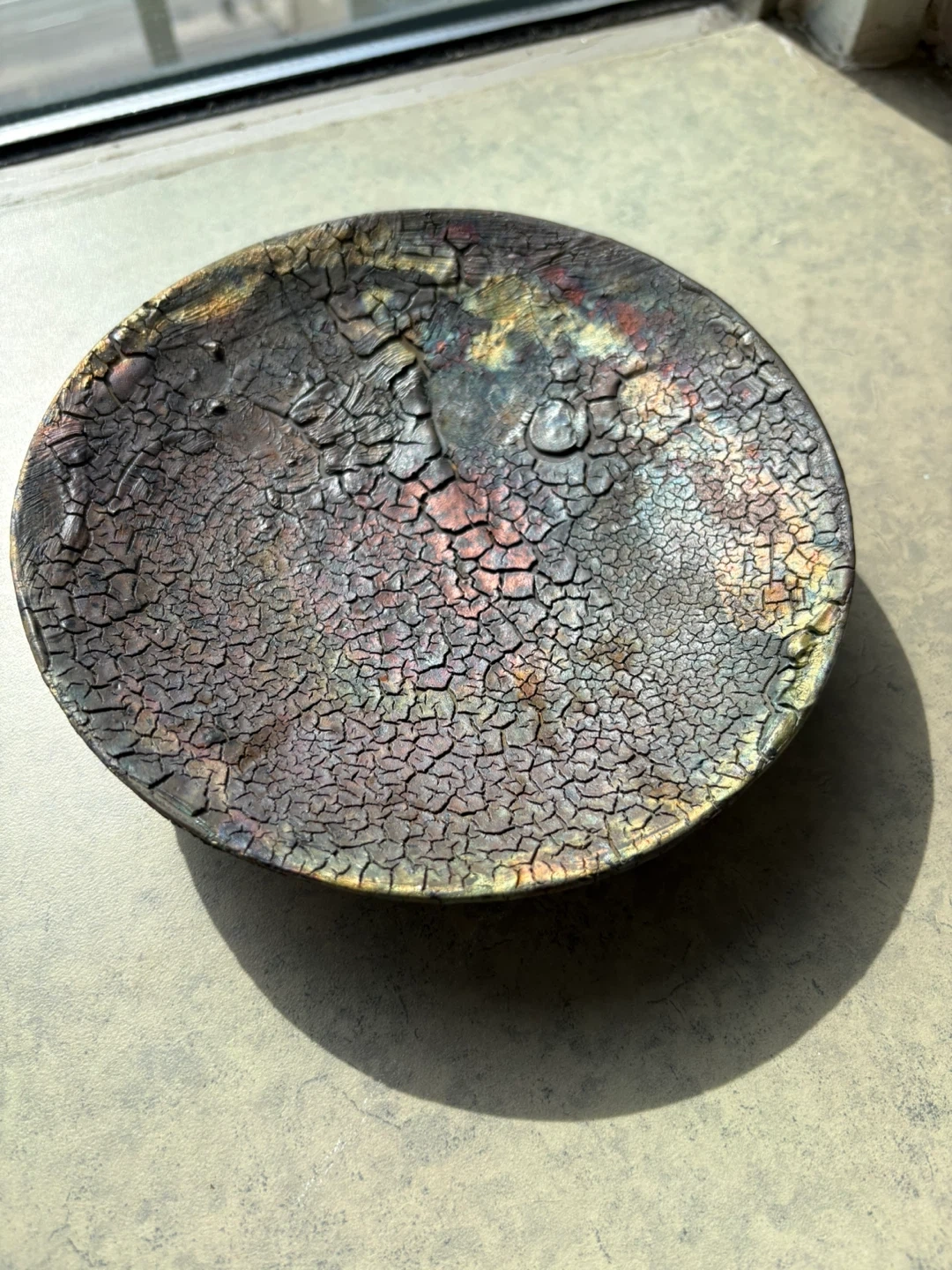 Selling a very unique decorative bowl. It has a textured surface with a mix of colours, making it a great piece for any room. It's in good condition and ready for a new home. Approx 10” across