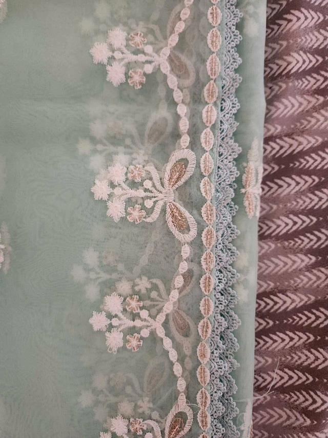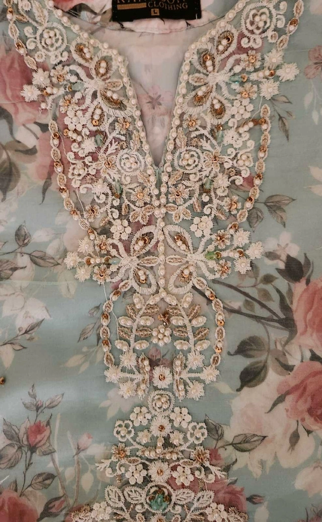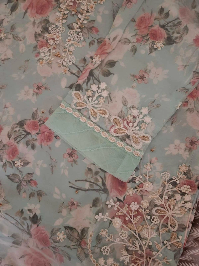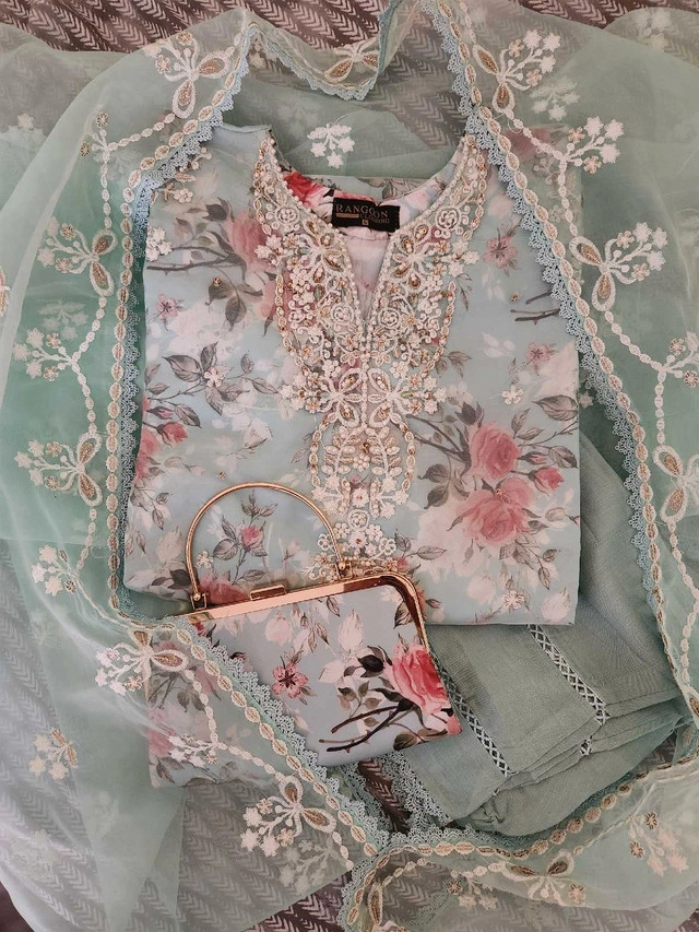 Beautiful turquoise colour embroidered suit with printed silk inner and embroidered along with clutch and soft organza embroidered dupatta.
