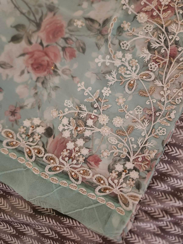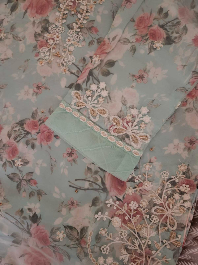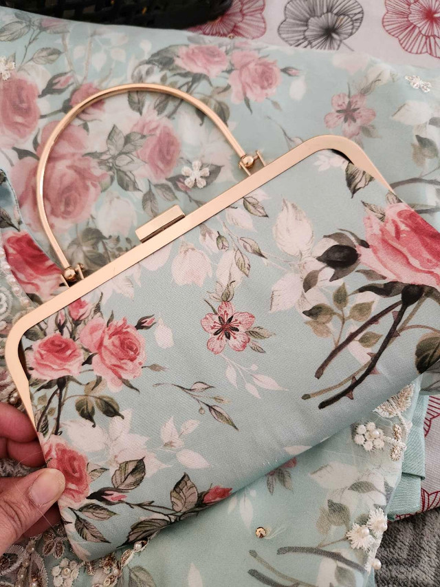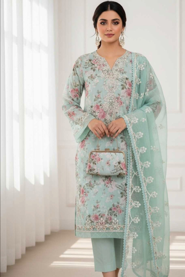 Beautiful turquoise colour embroidered suit with printed silk inner and embroidered along with clutch and soft organza embroidered dupatta.