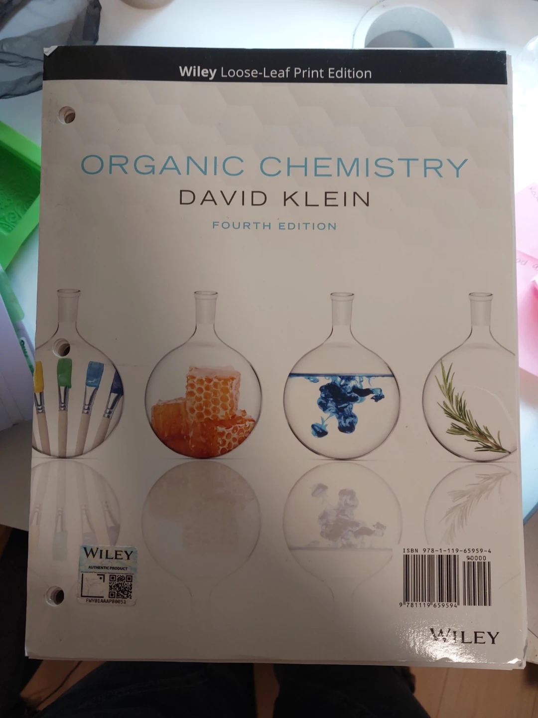 This is the Loose-Leaf Print Edition of Organic Chemistry 4th ed. by David Klein. It's in good condition, but has no casing so that will be needed separate as its a loose-leaf text. Common uni organic chemistry textbook