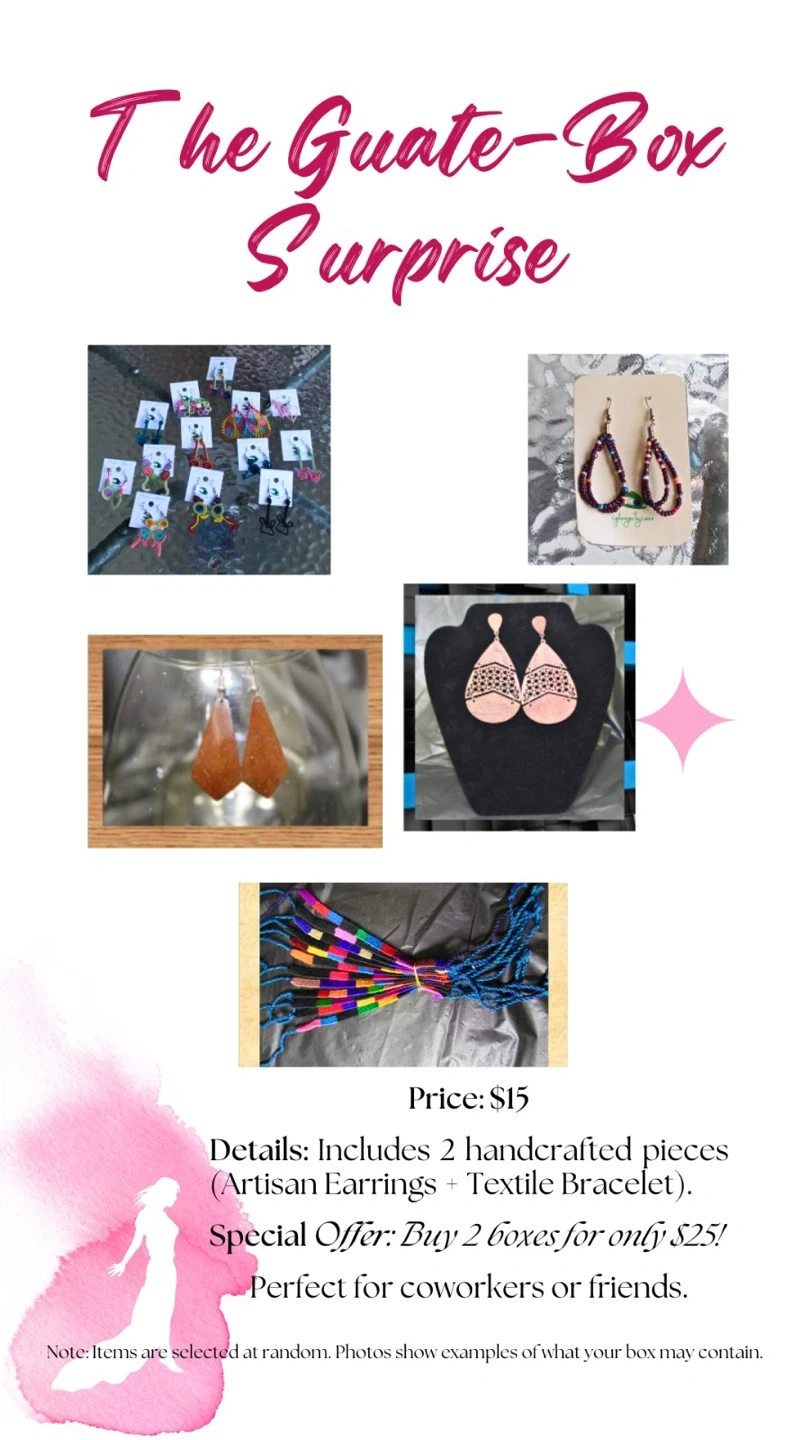 โจ The Guate-Box Surprise ($15): 3 handcrafted pieces (Artisan earrings + Textile bracelet). Special: 2 boxes for $25!