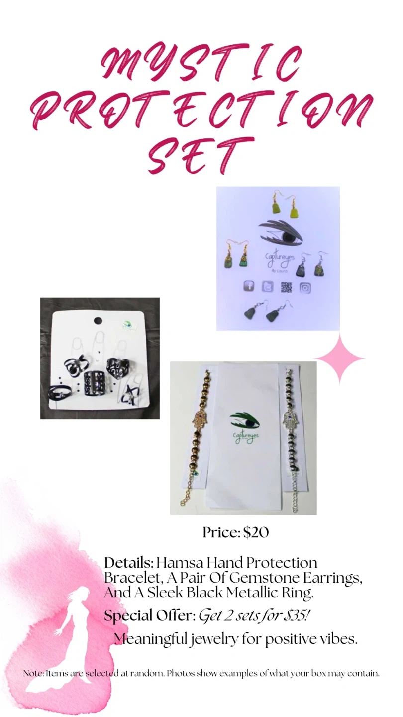 โจ Mystic Protection Set ($20): Hamsa Hand bracelet, gemstone earrings, and a sleek black ring.