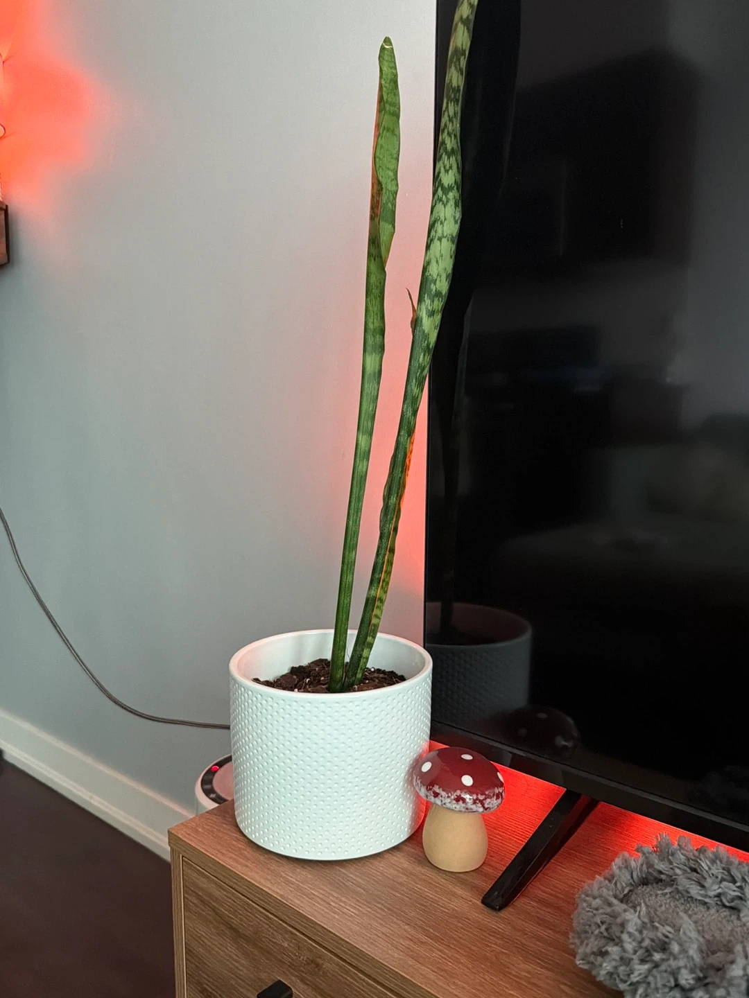 Snake plant with tall green leaves in a white textured ceramic pot. It's an easy-care plant. This would be great for someone looking to add some greenery to their space!