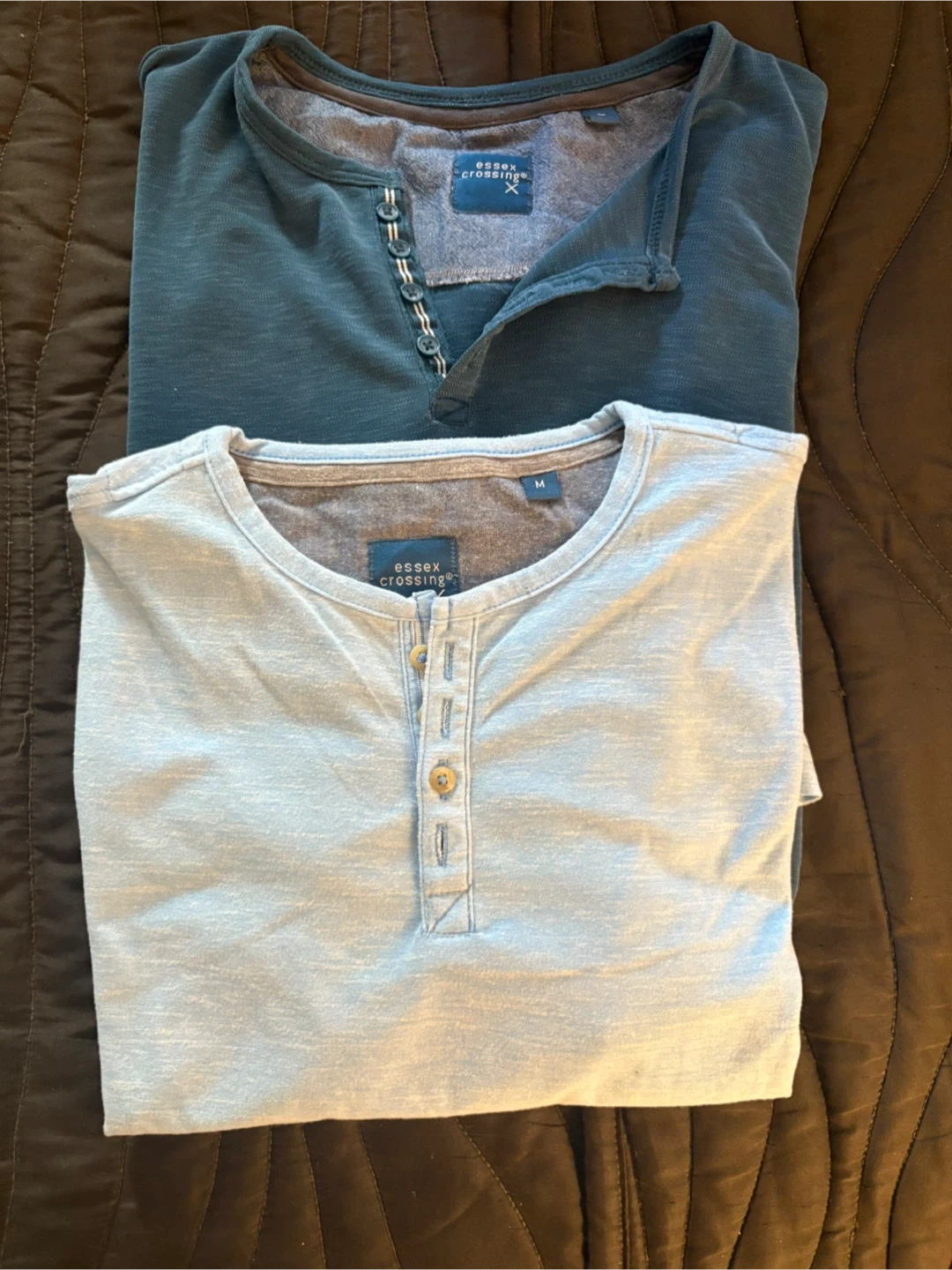 Two Essex Crossing henley shirts one size medium one large . One is a nice teal colour, and the other is a light blue. Both are in great condition and ready for a new home