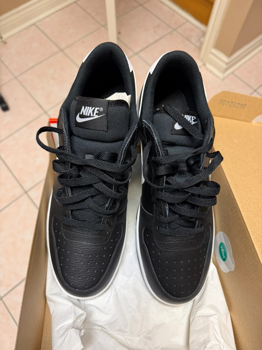 Classic black and white Nike Court Vision Low sneakers. These shoes feature a durable leather upper and a comfortable rubber sole. Comes with original box. Perfect for everyday wear!