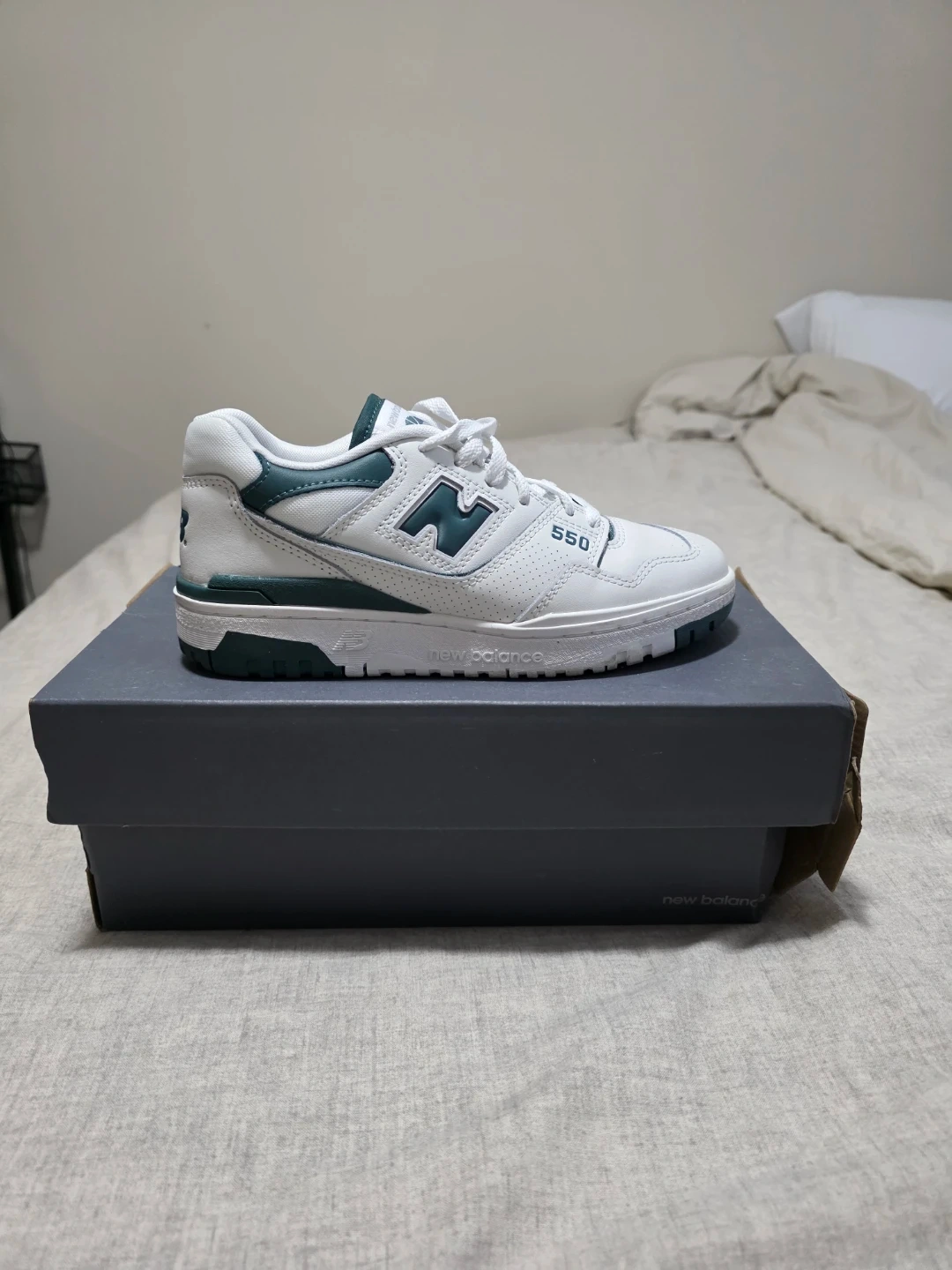Womens Classic New Balance 550 sneakers in white with forest green accents. These low-top shoes feature a leather and synthetic upper with perforations. They come in their original box. It's a great shoe for everyday wear! Purchased for $150