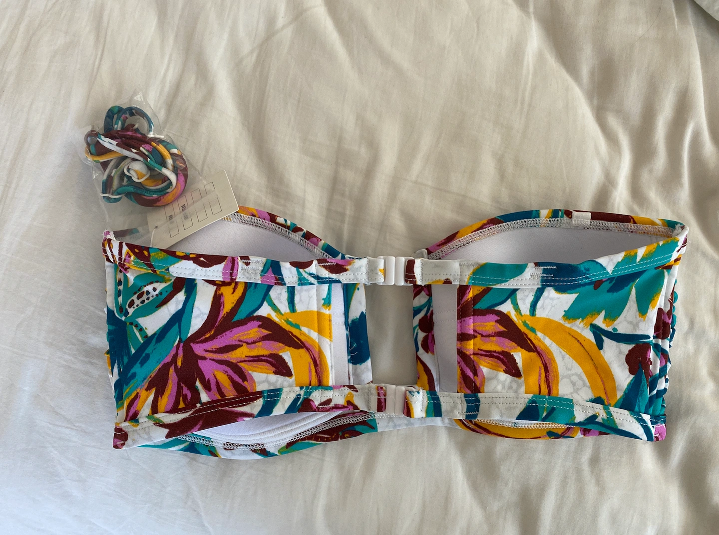 floral/plant print bikini top with square open front and double clasp at back, with removable straps
