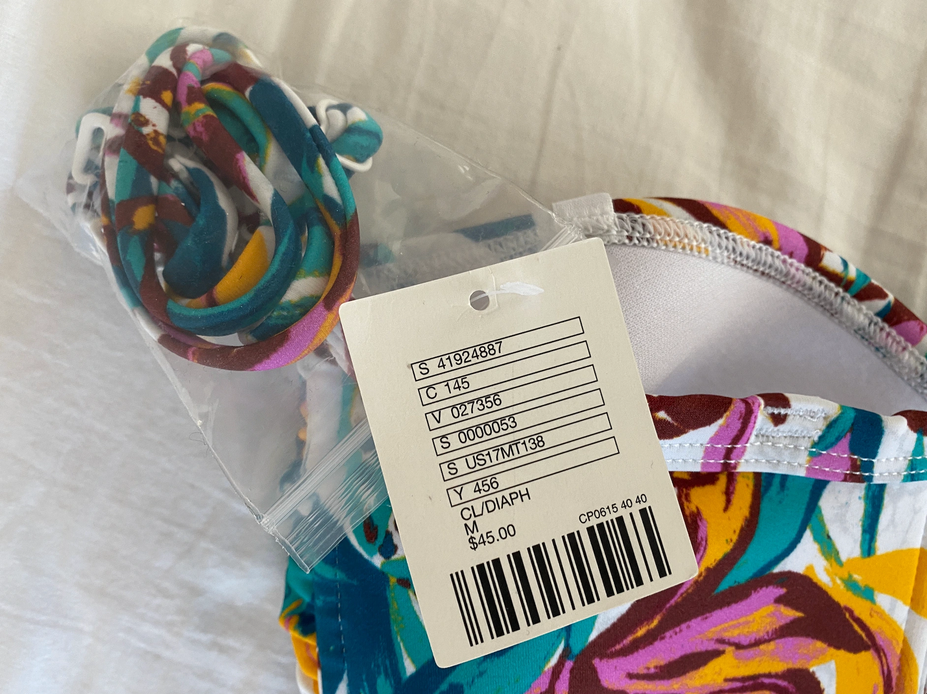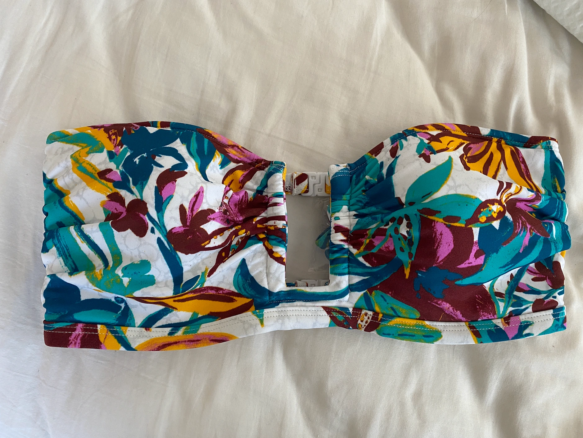 floral/plant print bikini top with square open front and double clasp at back, with removable straps