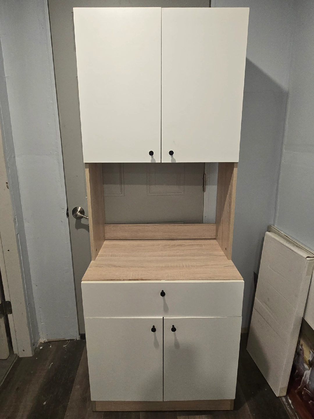 This is a kitchen cabinet with a white and wood finish. It features both drawers and cabinets for ample storage space. Perfect for organizing your kitchen essentials!