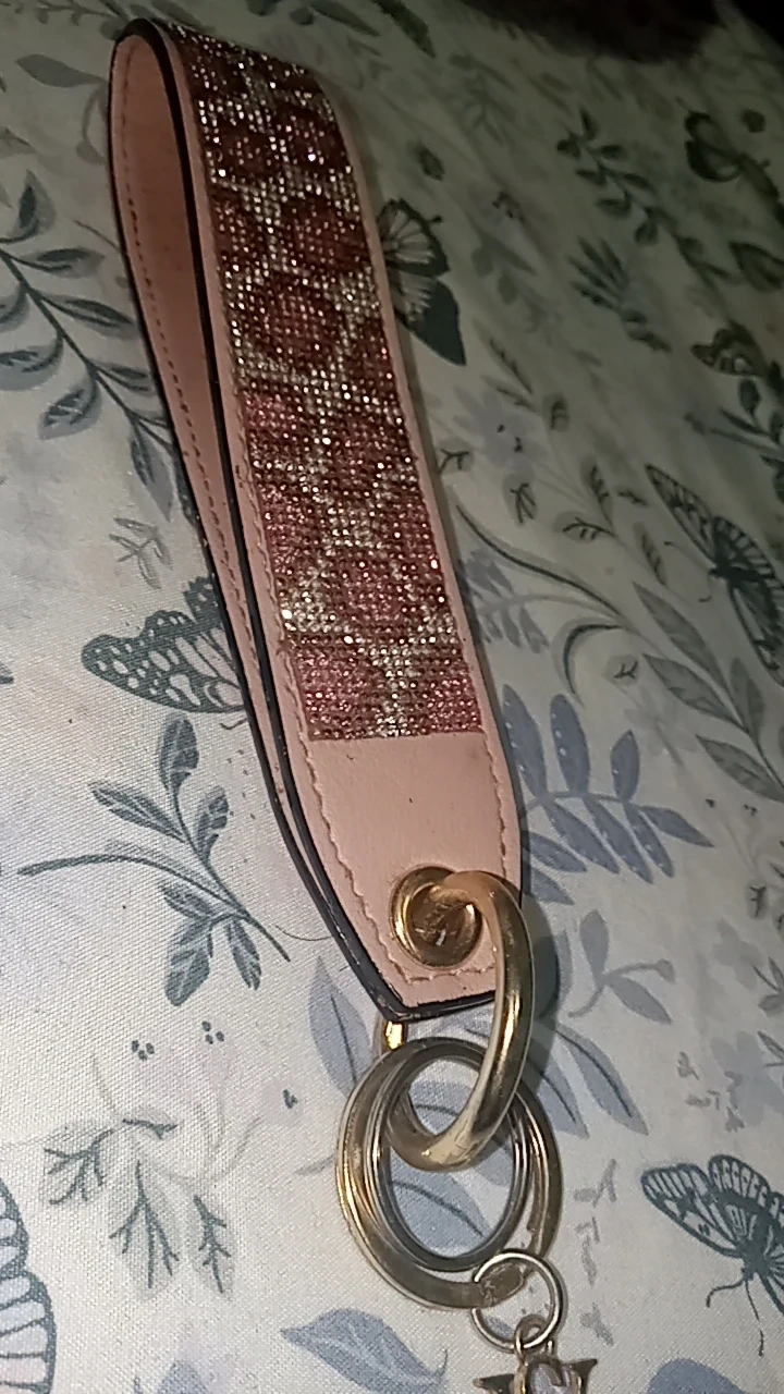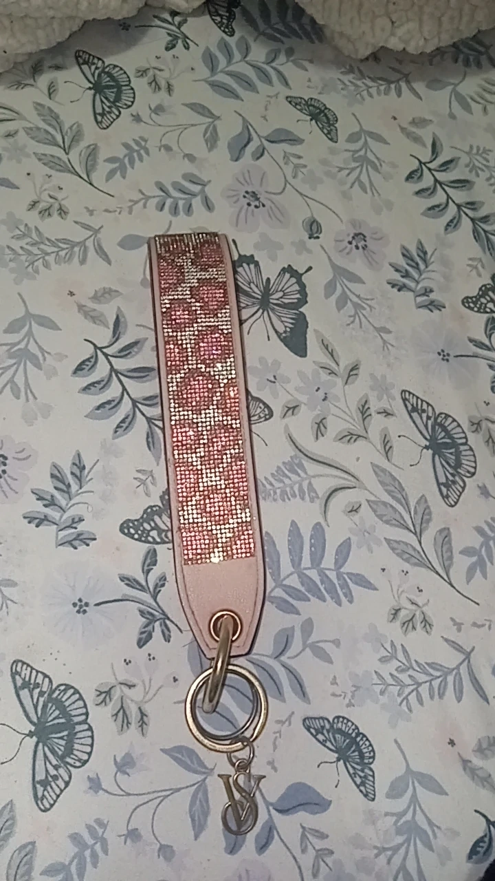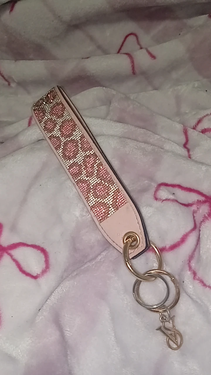 This is a Victoria's Secret wristlet strap keychain. It features a pink glitter leopard print design on one side and a light pink leather-like material on the other. Comes with a gold-tone ring and a VS charm. Attaches to keys or bags!